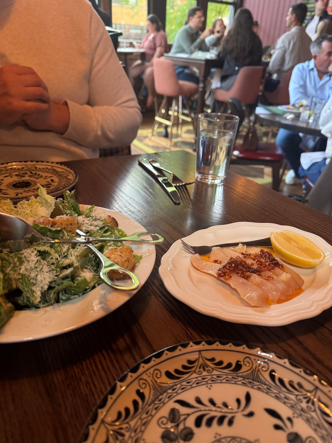 We got a Caesar, Hamachi Crudo, Pizza, House made Pasta and Ribeye Cacciatore.