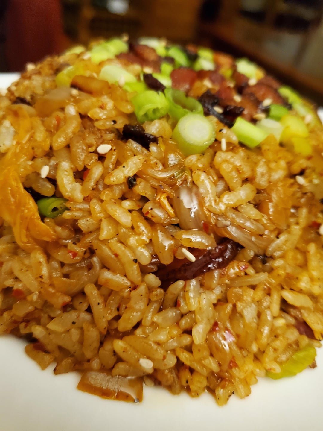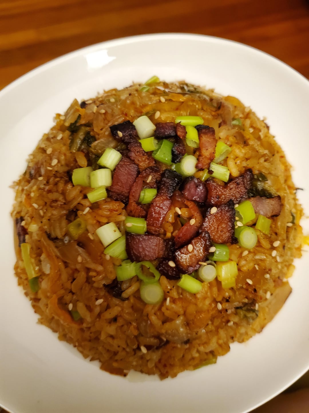 Awesome job! Could use some eggs either mixed in or sunnyside on top. I would also suggest adding the seasoned gim bits you can get at the Asian grocery store. And if you want to go the extra step, flatten it out evenly in the pan and let the bottom get all fried and crispy. Adds great texture. Also works well with the Korean spicy pork belly (and/or spam)