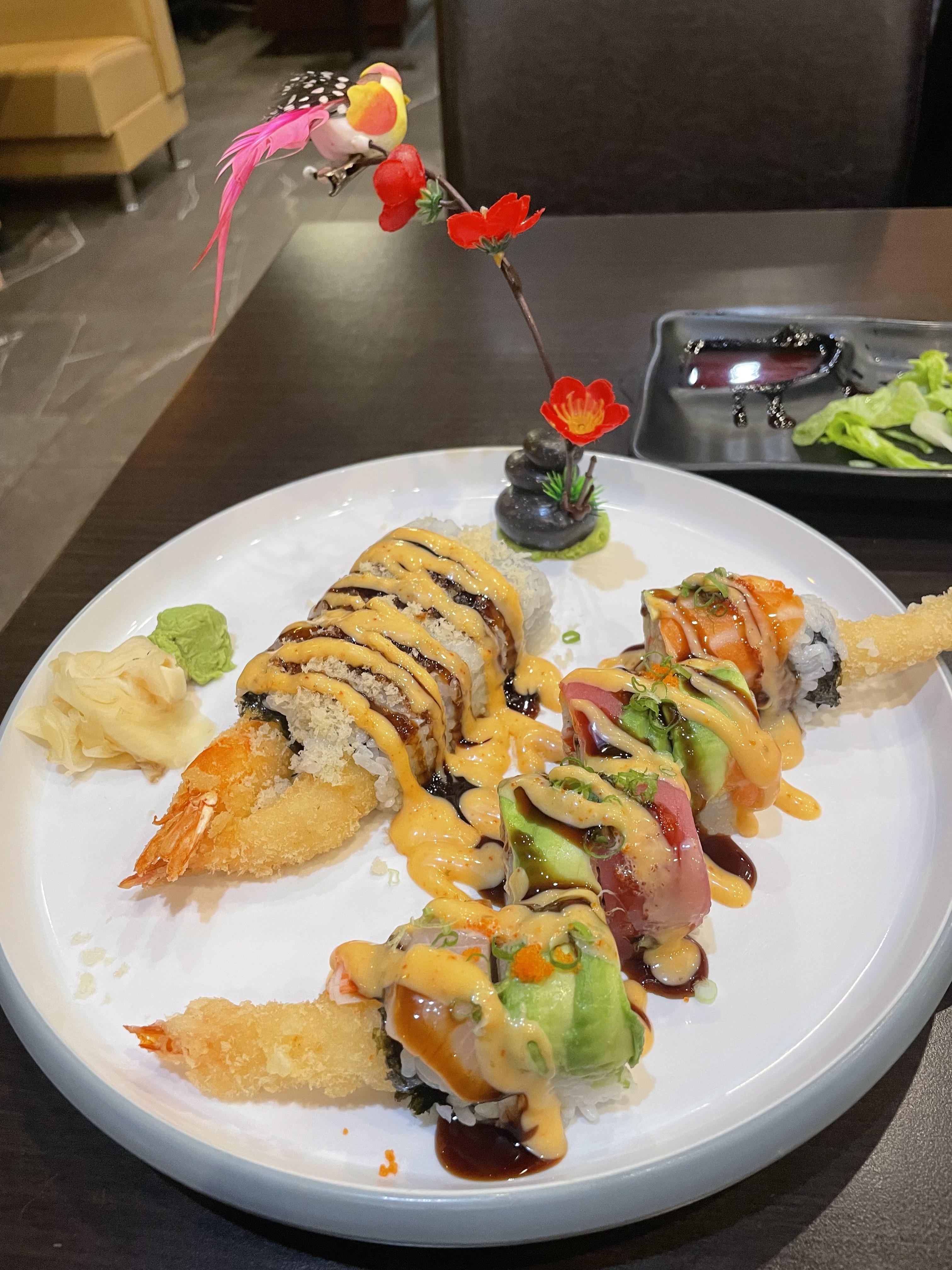 Sushi was OK, especially considering the price! I just don’t understand the aquarium decor or the roach clip bird 😂