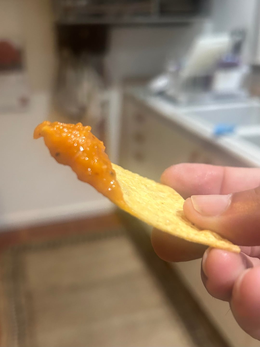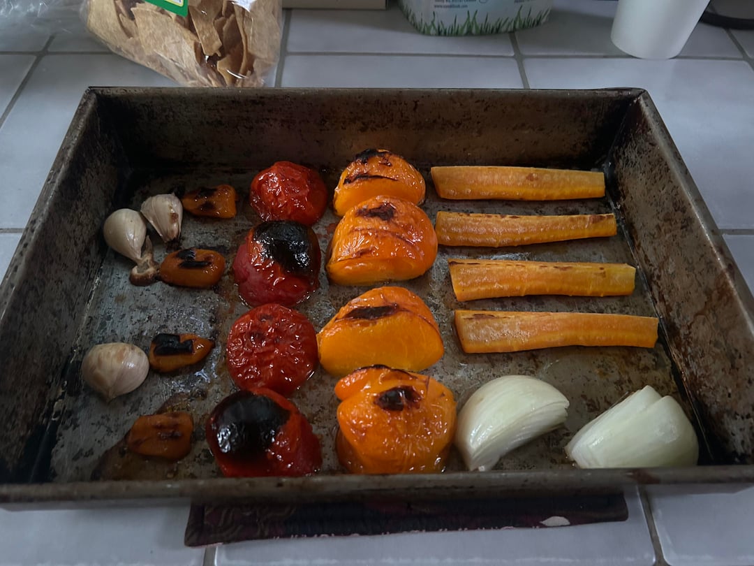 Roast all the veggies at 400 for about 20 minutes, then give ‘em another couple minutes under the broiler. Blend it all up with the salt and chicken bouillon, add lime juice to taste.