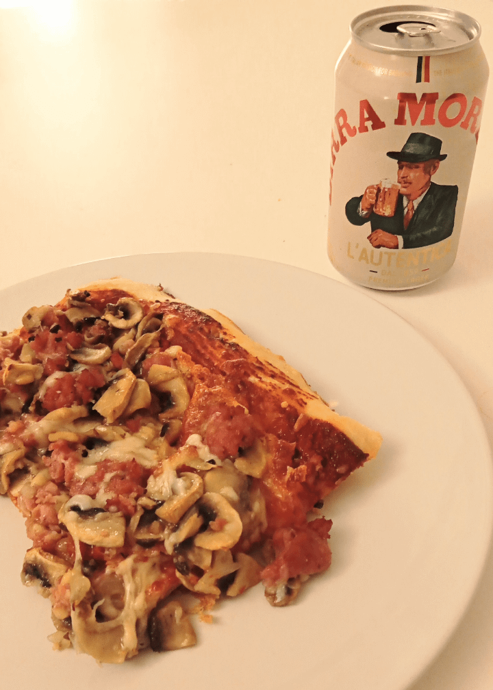 As I only have a normal oven that gets to somewhere between 200 and 250°C I can obviously not make proper round Italian pizzas. The kitchen is small too and the shaping annoying, so I tried myself on pizza in teglia. Home made dough, topped with lots of mozzarella, mushrooms and salsiccia.