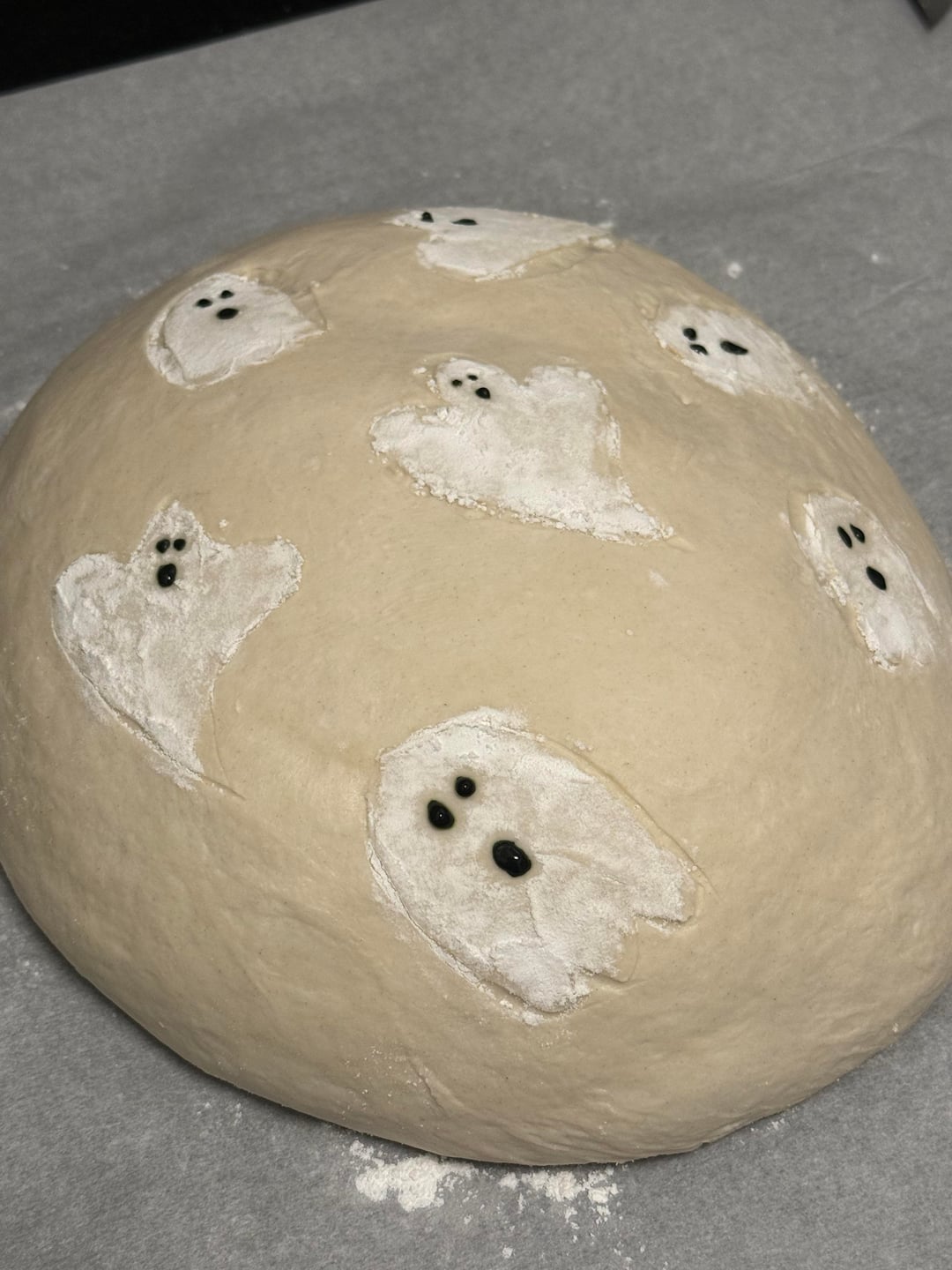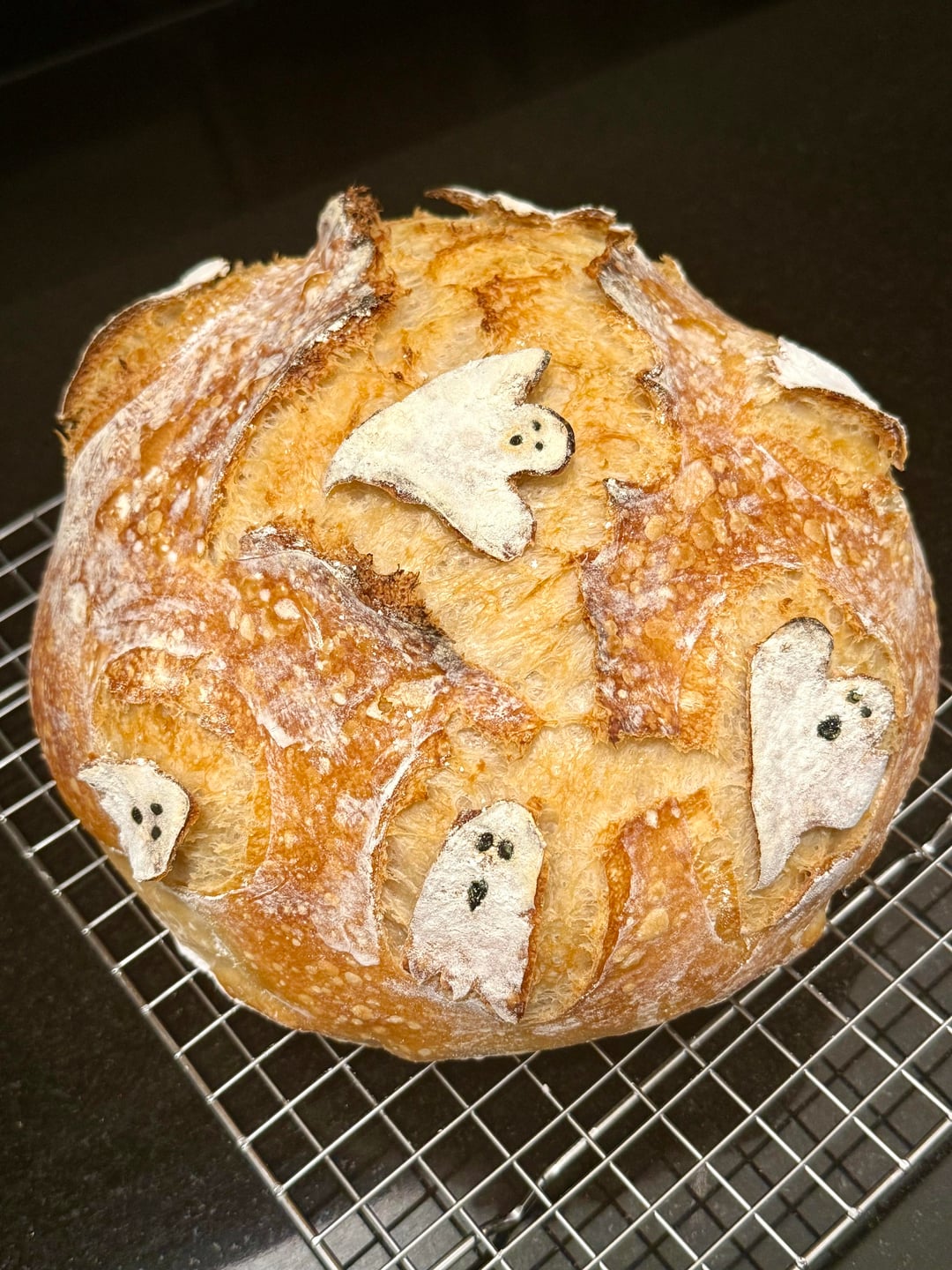 Mix ingredients together and perform 4 sets of stretch and folds. I let this rise for 5 hours before shaping and popped into the fridge overnight. Once ready to bake I scored the ghosts & applied rice flour only to ghosts. I used starter & black food coloring for the eyes and mouth of the ghosts. Bake at 450 for 30mins covered and 15 mins cover off 😊