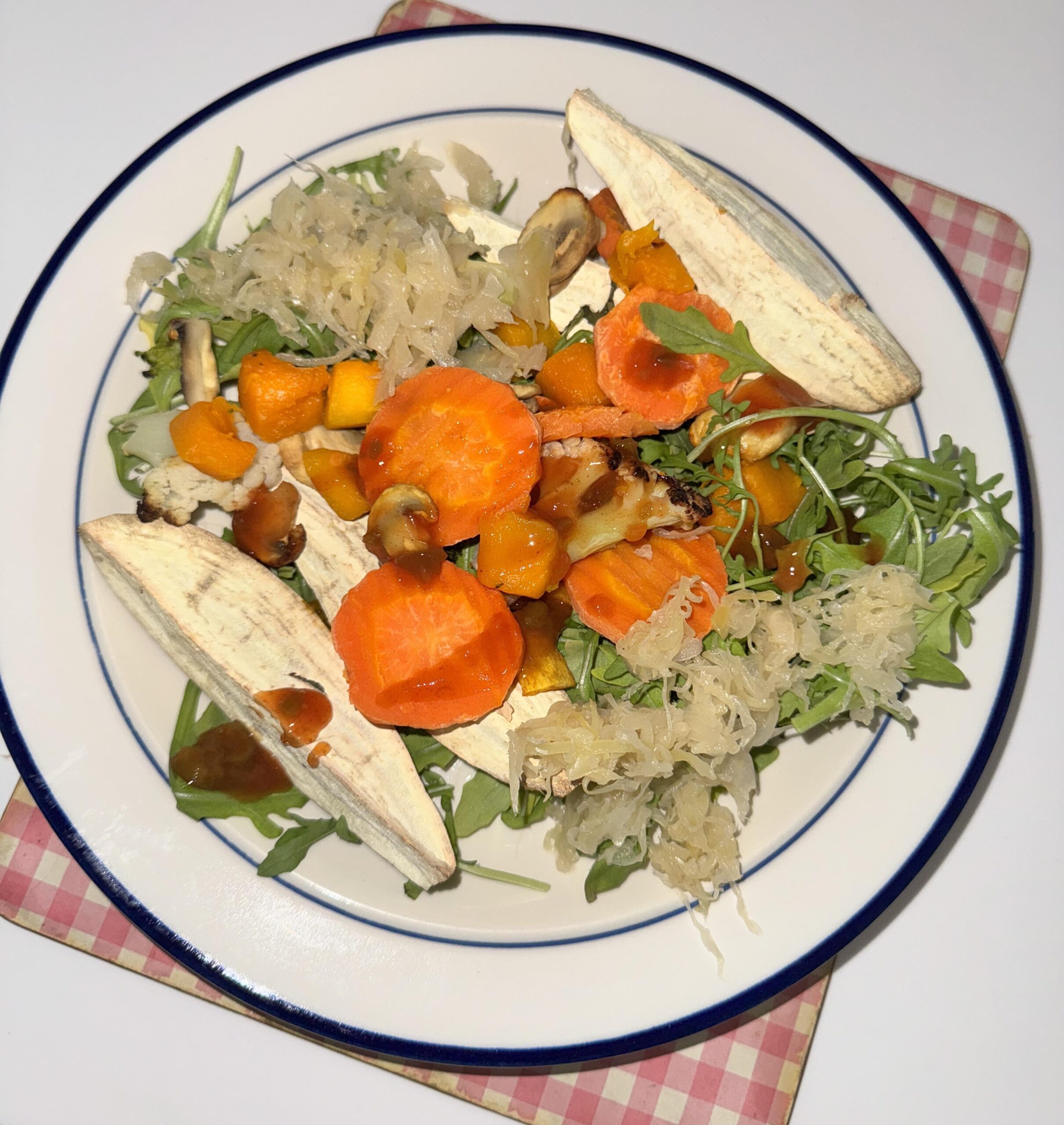 I used rocket as the base, and added sauerkraut, sweet potato, carrots, pumpkin, broccoli, cauliflower and topped it with taco sauce. Totalled only 309 calories! by strawberrie_choco Dining and Cooking