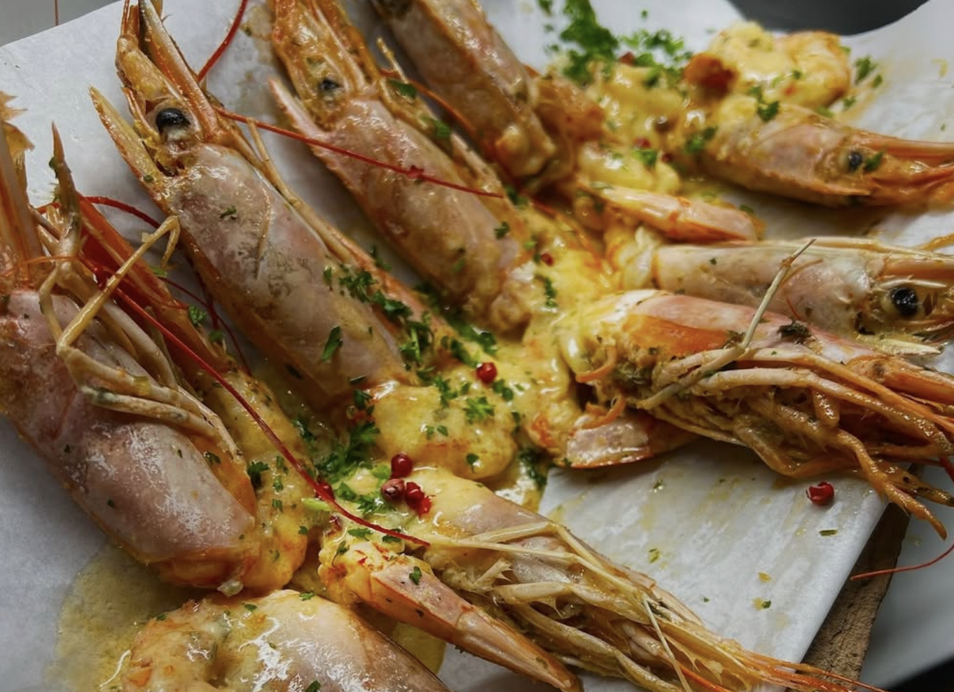 Prawns in lemon sauce cooked on Sicilian terracotta tiles at Savia in Boca Raton