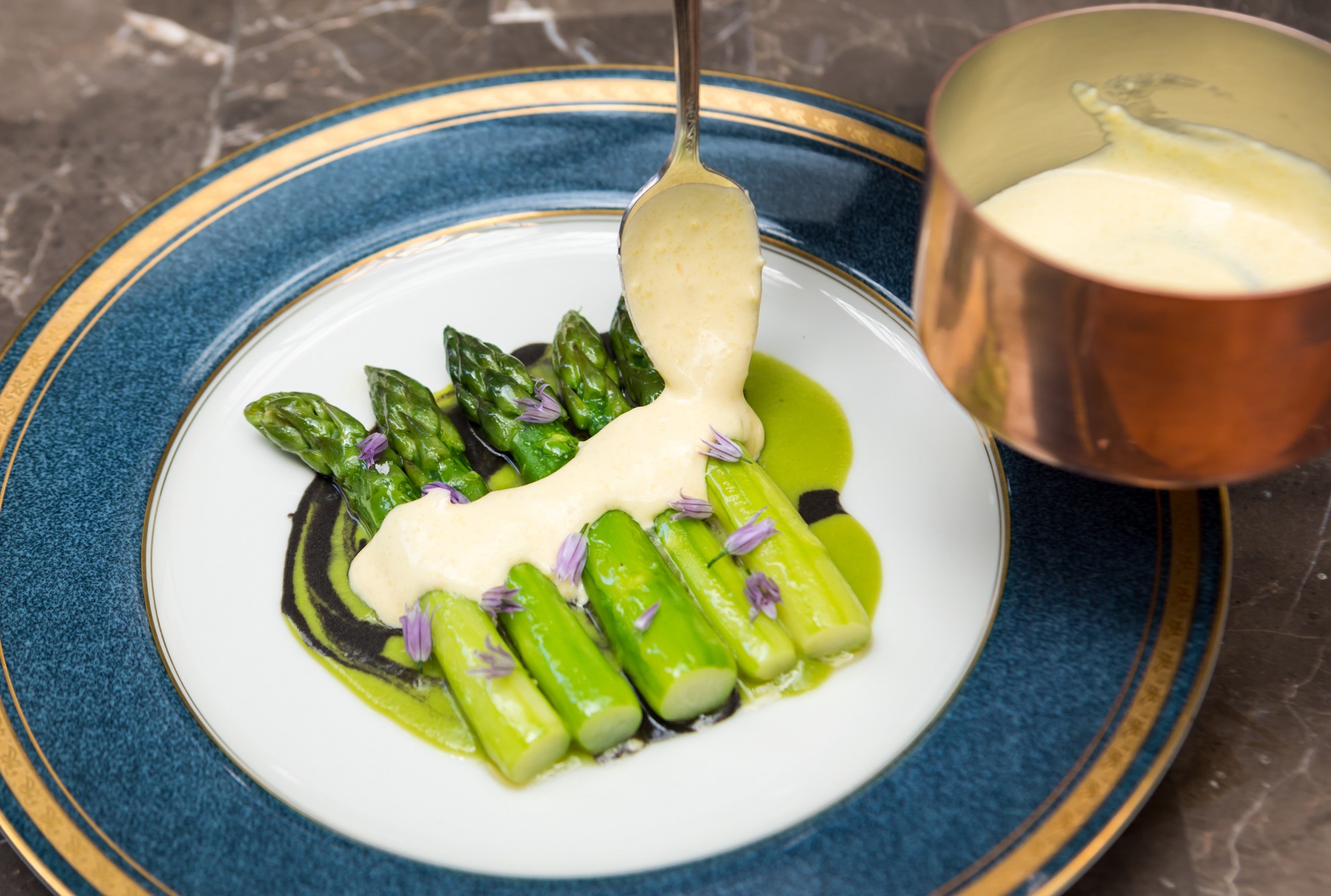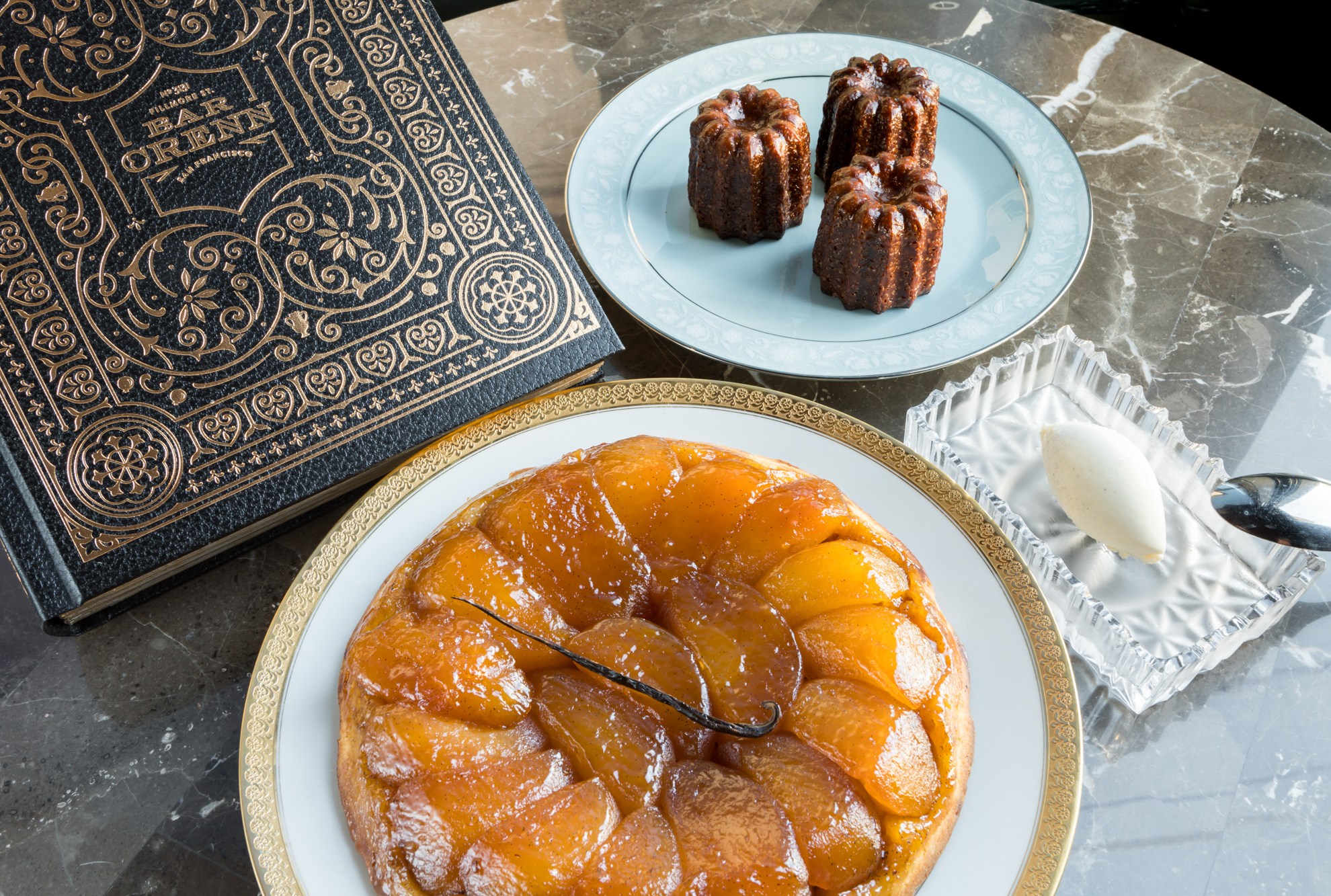 From top left: quenelle Lyonnaise; asparagus with hollandaise; tarte tatin with vanilla ice cream and caneles at Bar Crenn in San Francisco Patricia Chang/Eater SF