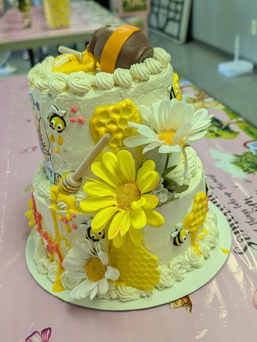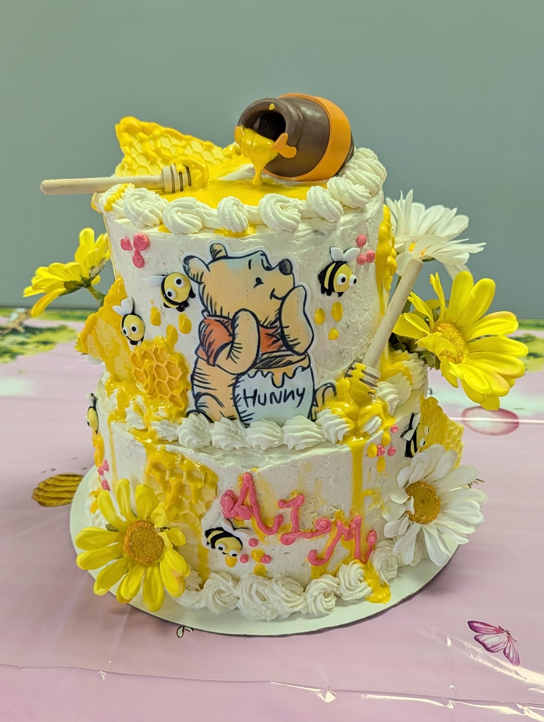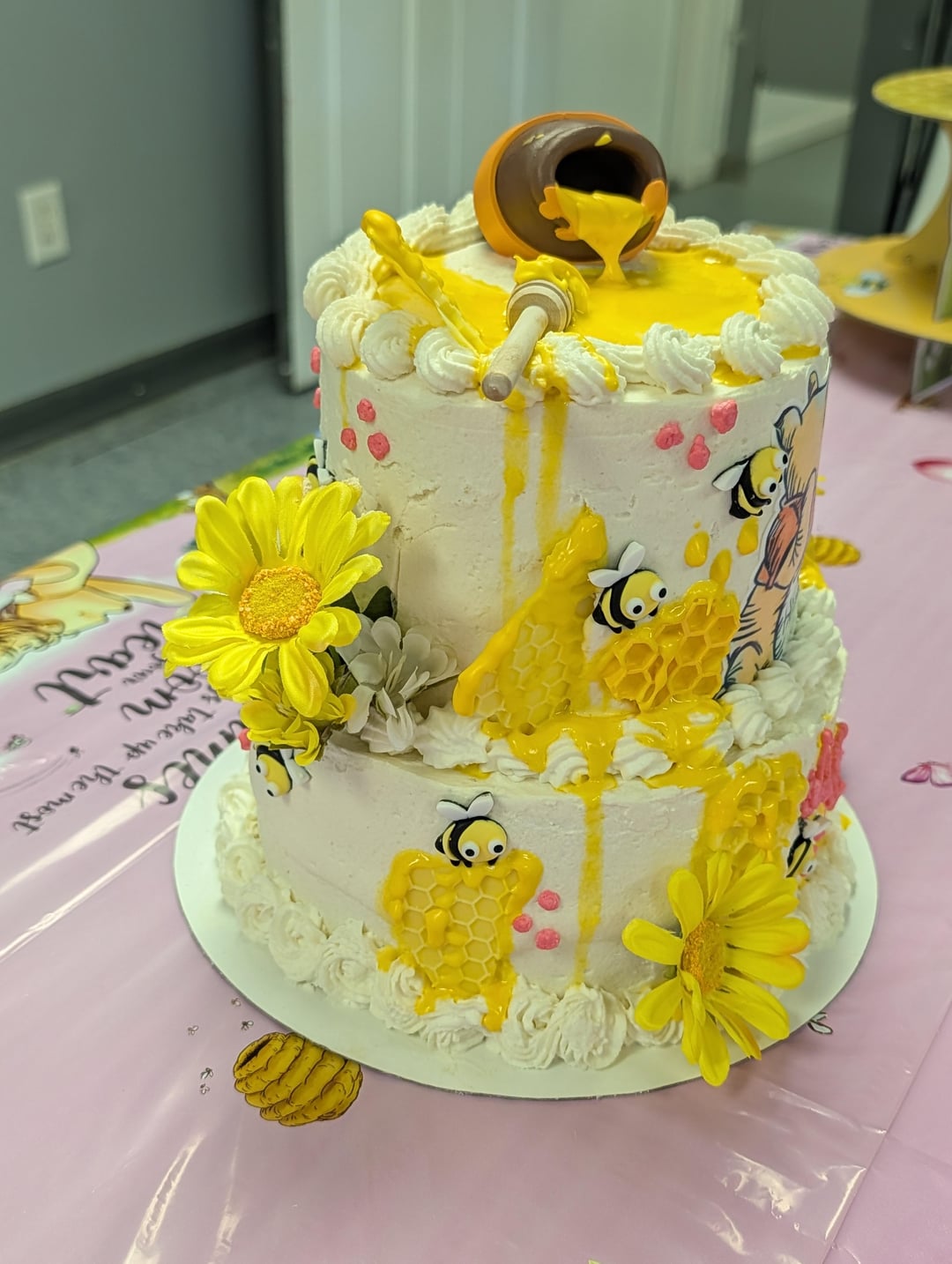 I had one of my cheesecake customers reach out and commission a baby shower cake. They loved it, and I love it. I made a marble pound cake with pink whipped in the middle. The honeycombs are made of chocolate and the "honey" is royal icing. The bees are premade that I bought. Pooh is an edible image I ordered (specific customer request).