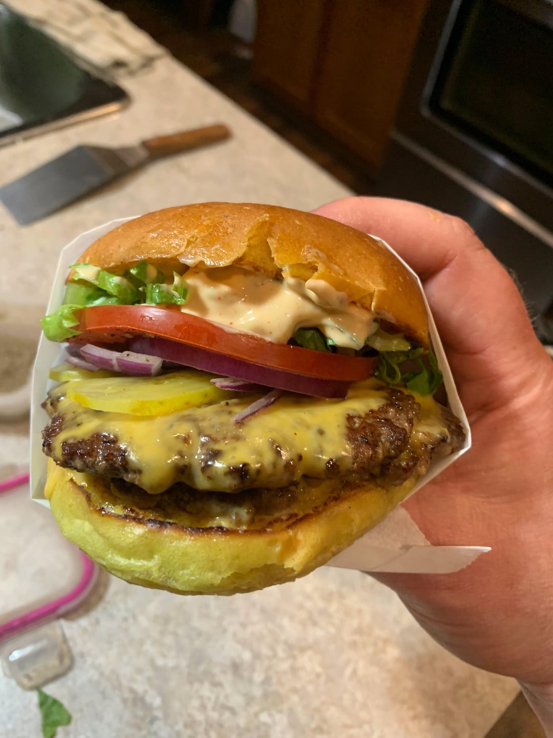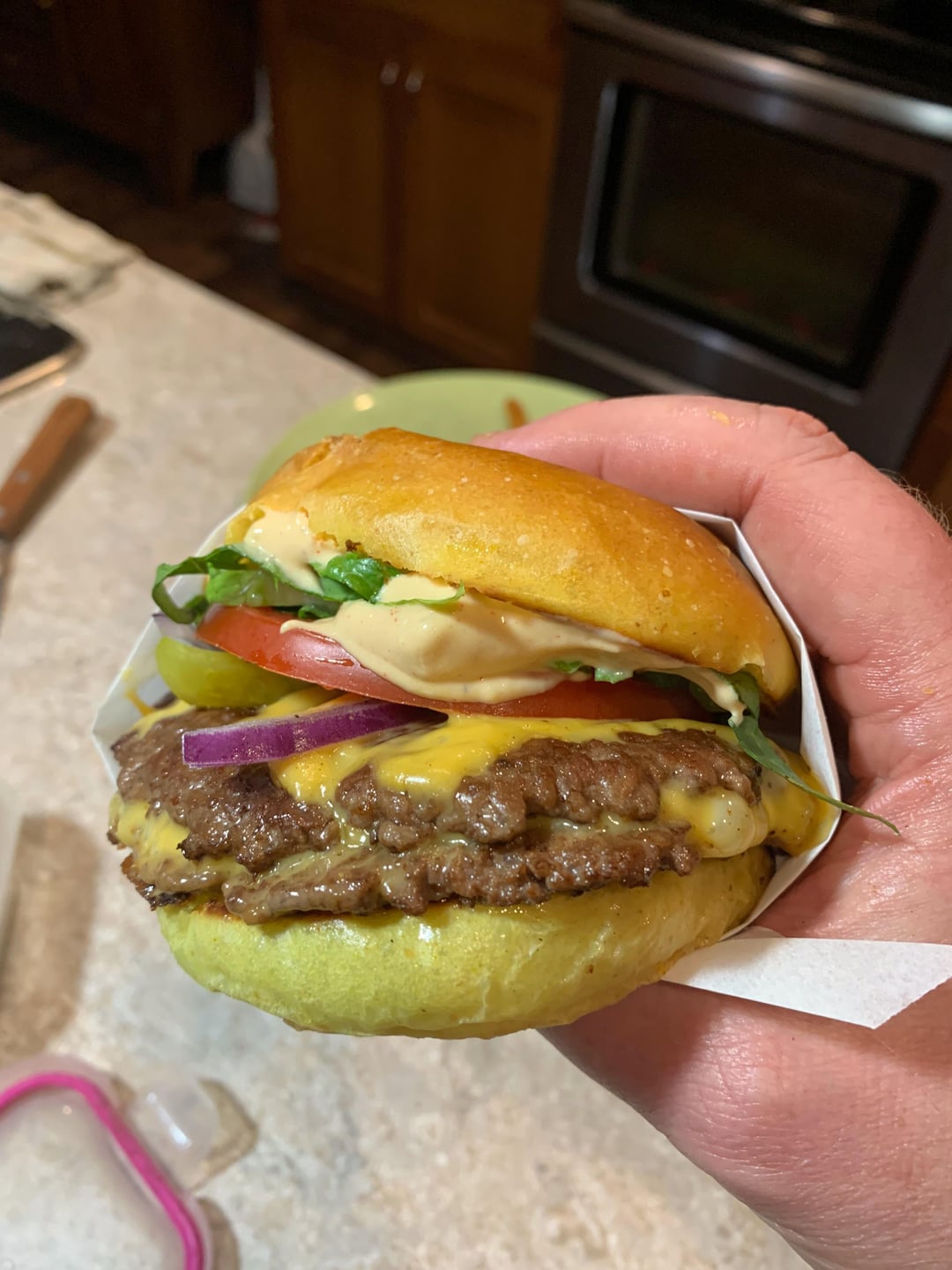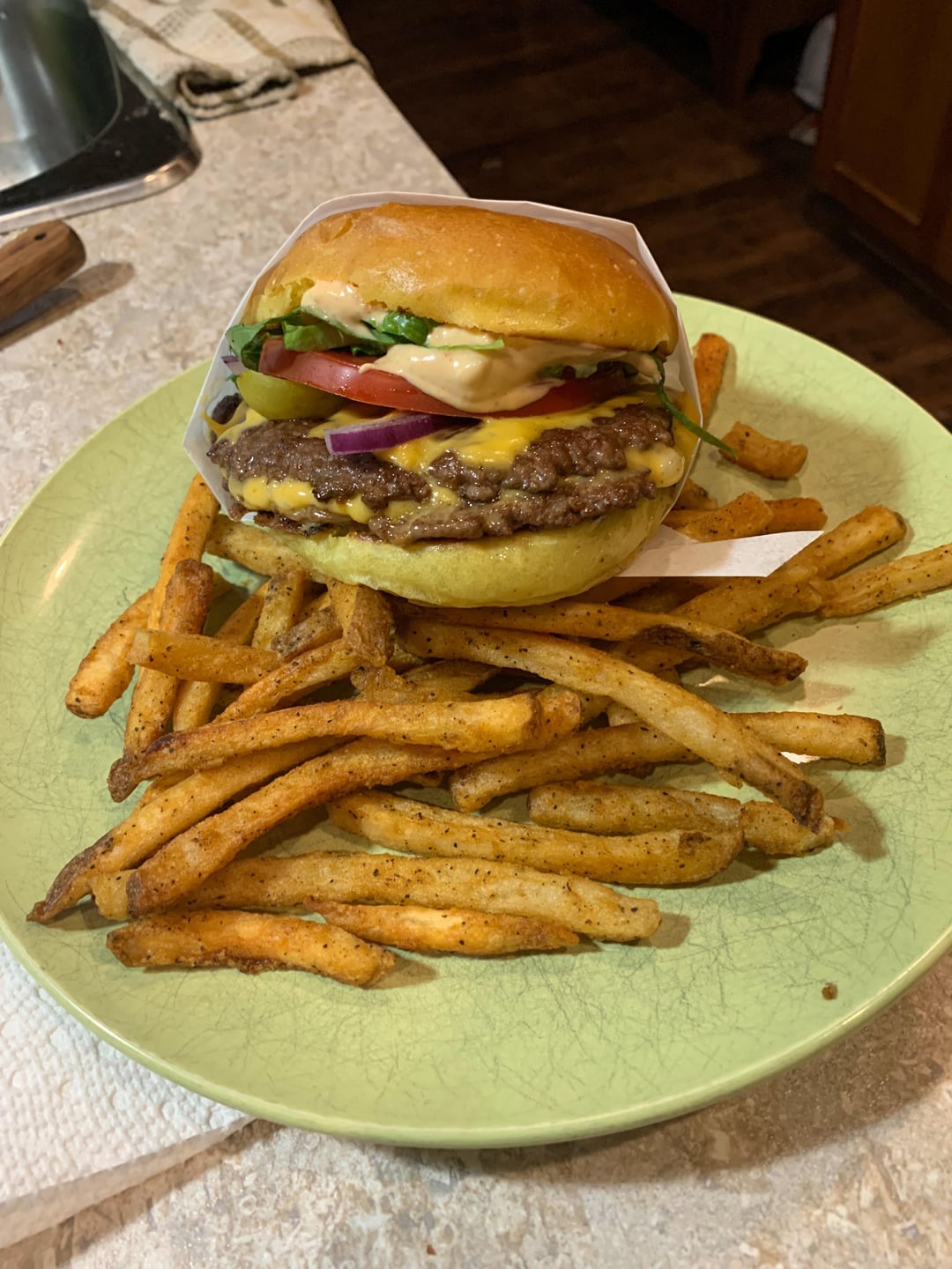 Sunday night double smash burgers on homemade potato rolls.Fries are just frozen fries prepped in high temp oven.by Smartmuscles Dining and Cooking
