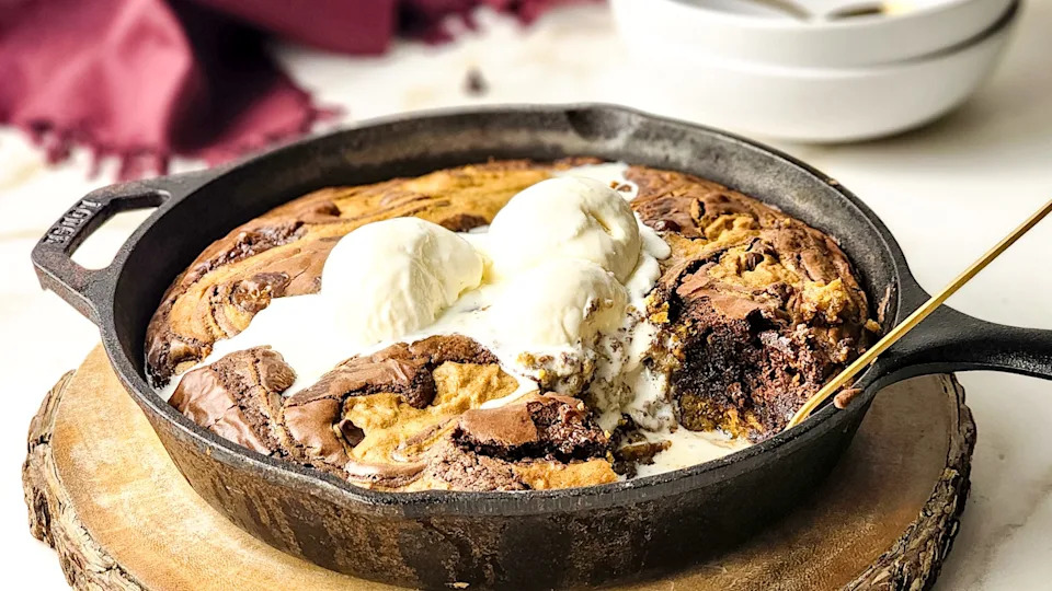 Topped with vanilla ice cream that melts over the warm brownie, this Pumpkin Spice Brownie Skillet is a truly delicious treat. Each bite is filled with warm, cozy flavors that perfectly capture the taste of fall, making this Caramel Pumpkin Brownie Skillet a dessert you’ll want to make over and over.
