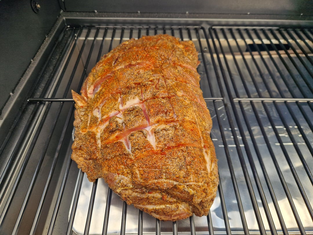 Used mustard as a binder, hit it with a mix of SPG and Angus & Oink Hot Chilli Rub. I like that rub since it’s solid across chicken, beef, and pork. I thought I might have gone overboard on seasoning, but now I know pork can take way more pepper than I expected to create more of a solid bark.