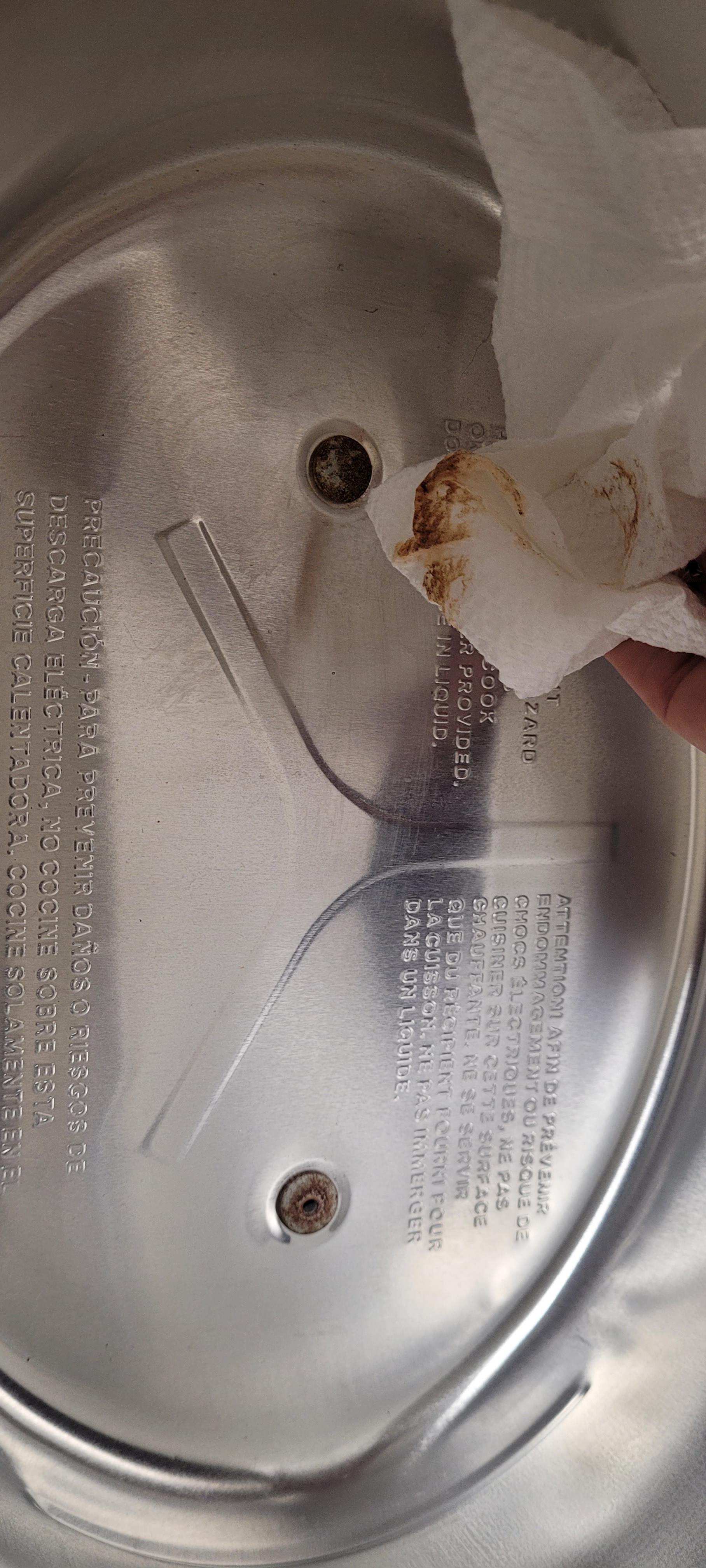 Also the bolts(?) inside the base look corroded and had bubbled orange/brown gunk on the outside. Took a picture of the base gunk. This is only my second time using my brand new Crockpot.
