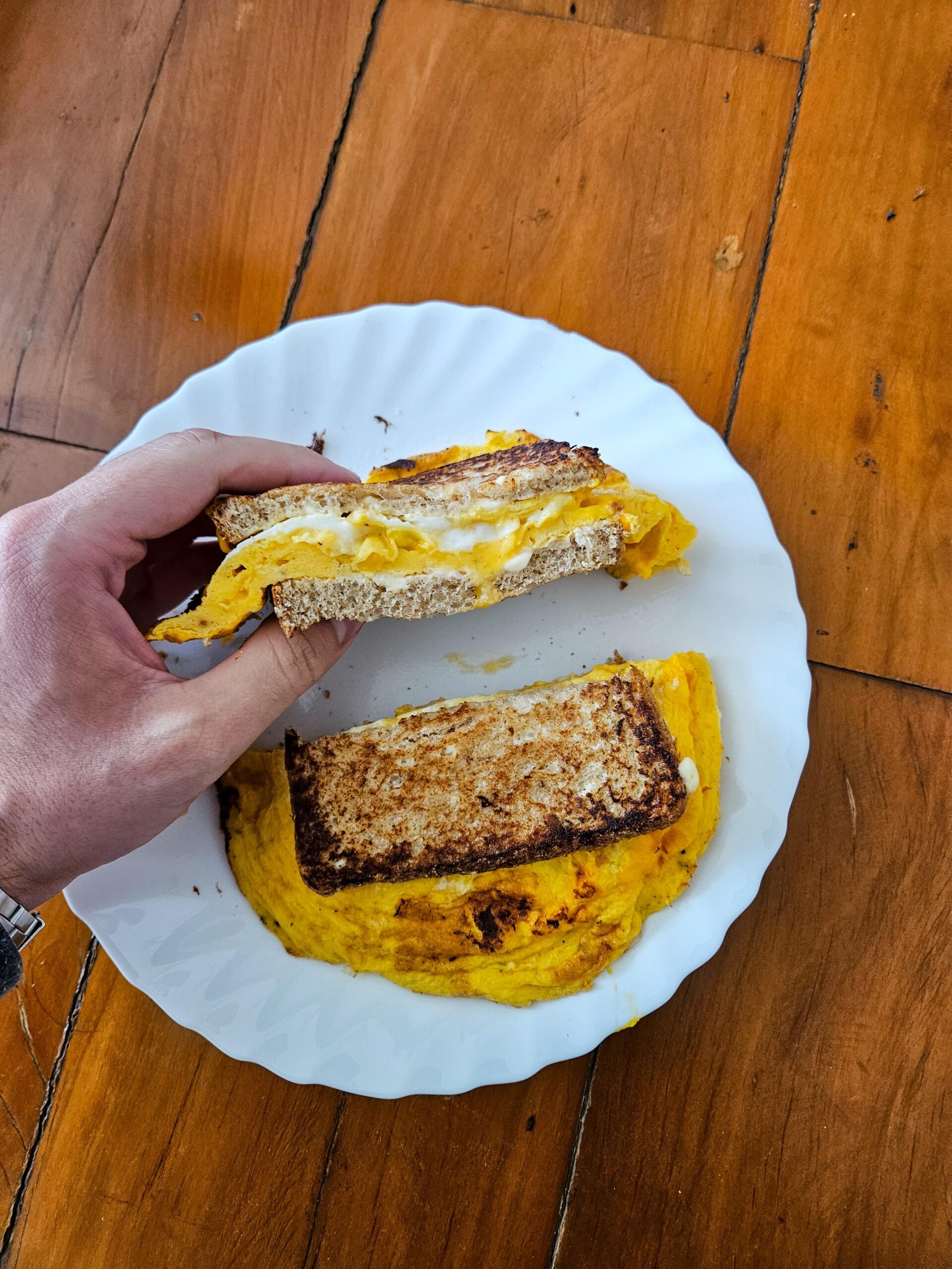 4 eggs cheesy omelet, ton of butter, cheap whole wheat bread with mayo on both sides. Instructions: make a big ass omelet and put it between bread. by MartianOstrich08 Dining and Cooking