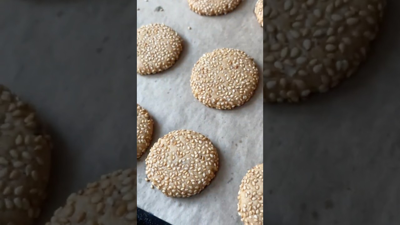 30 minutes and a handful of ingredients is all you need to make this amazing tahini cookies. Let’s start. You need tahini, honey, some salt, some baking soda. Mix it together. Add some flour and crushed walnuts. Give it another mix until the dough comes together. As you notice, this recipe does not call for refined sugar. Form the dough into balls and then roll them in sesame seeds. Place them on a baking sheet lined with parchment paper and then flatten them using a glass. And that’s it. Bake it in the oven for about 12 to 15 minutes until the bottom is just a little bit golden. And that is it. Easy and delicious. Give it a try and enjoy.