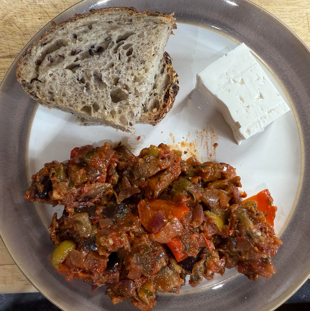 Leftover caponata, feta and seedy sourdough. Looooooved this as an easy lunch. An extra bit of olive oil for the bread would have been nice but there’s a lot in the caponata and I’m also trying to lose weight so can’t go too overboard! The caponata was even nicer the next day.