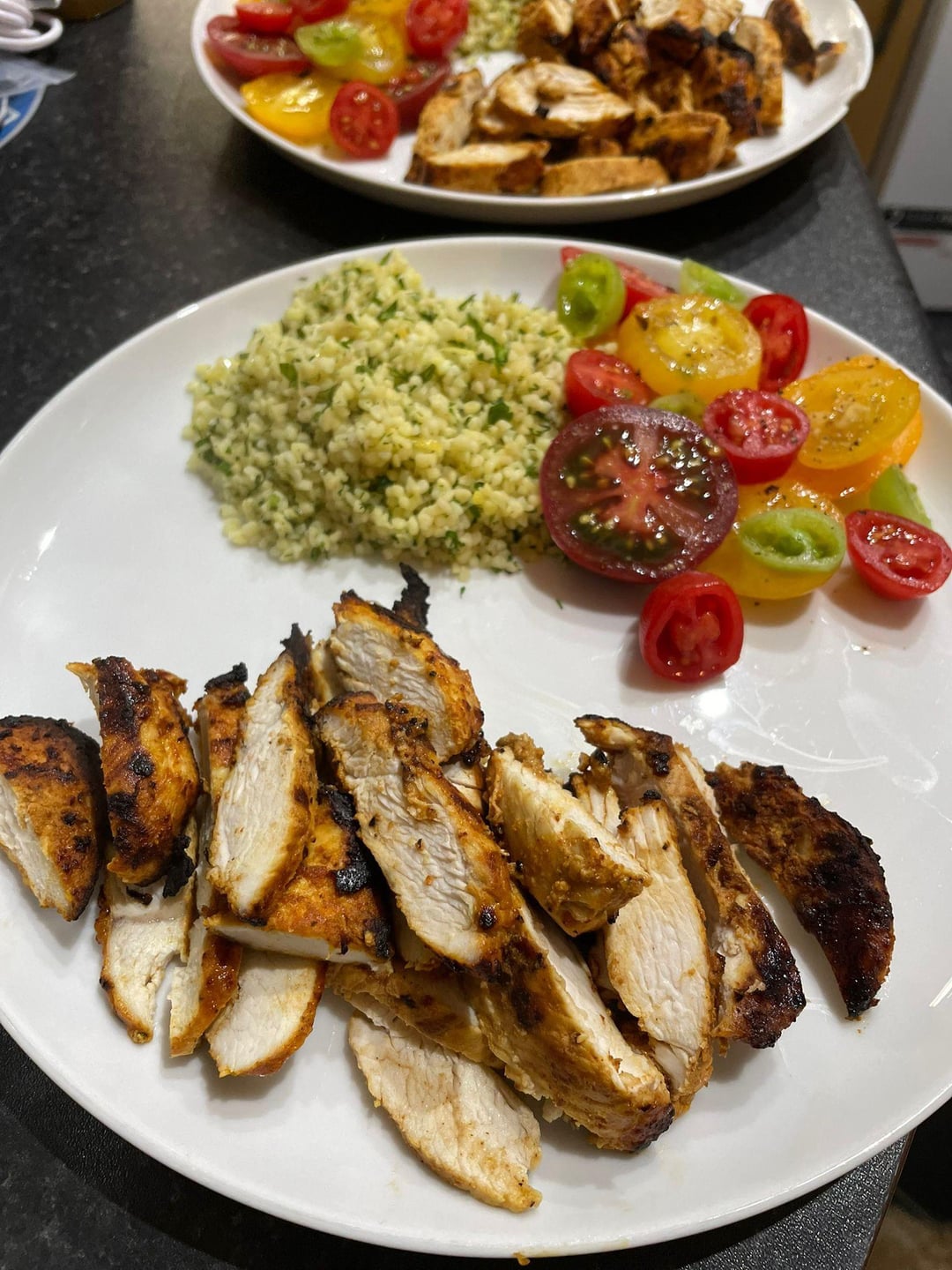 Shawarma style chicken breast, leftover bulgur salad and some tomatoes. My husband took this photo so it’s much better framed! I’m going to have this for lunch tomorrow too. I used the following recipe from Reddit for the Shawarma but used chicken breast instead of thigh, cut them in half horizontally, and used the broiler/grill setting on my air fryer: https://www.reddit.com/r/Cooking/s/stQ5UhWevb
