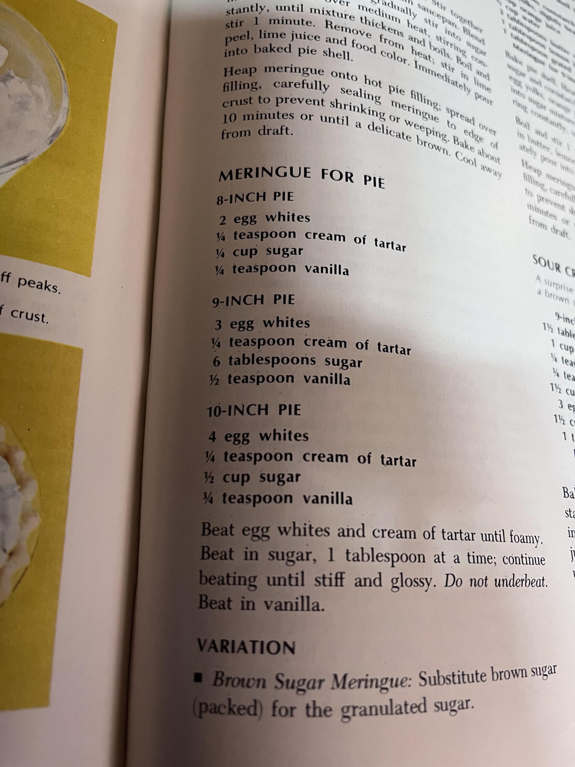 I was just going over the recipe for the Lemon Pie and realized the Meringue recipe was on the following page. Here it is. Let me know if you also need the recipe for the pie crust.