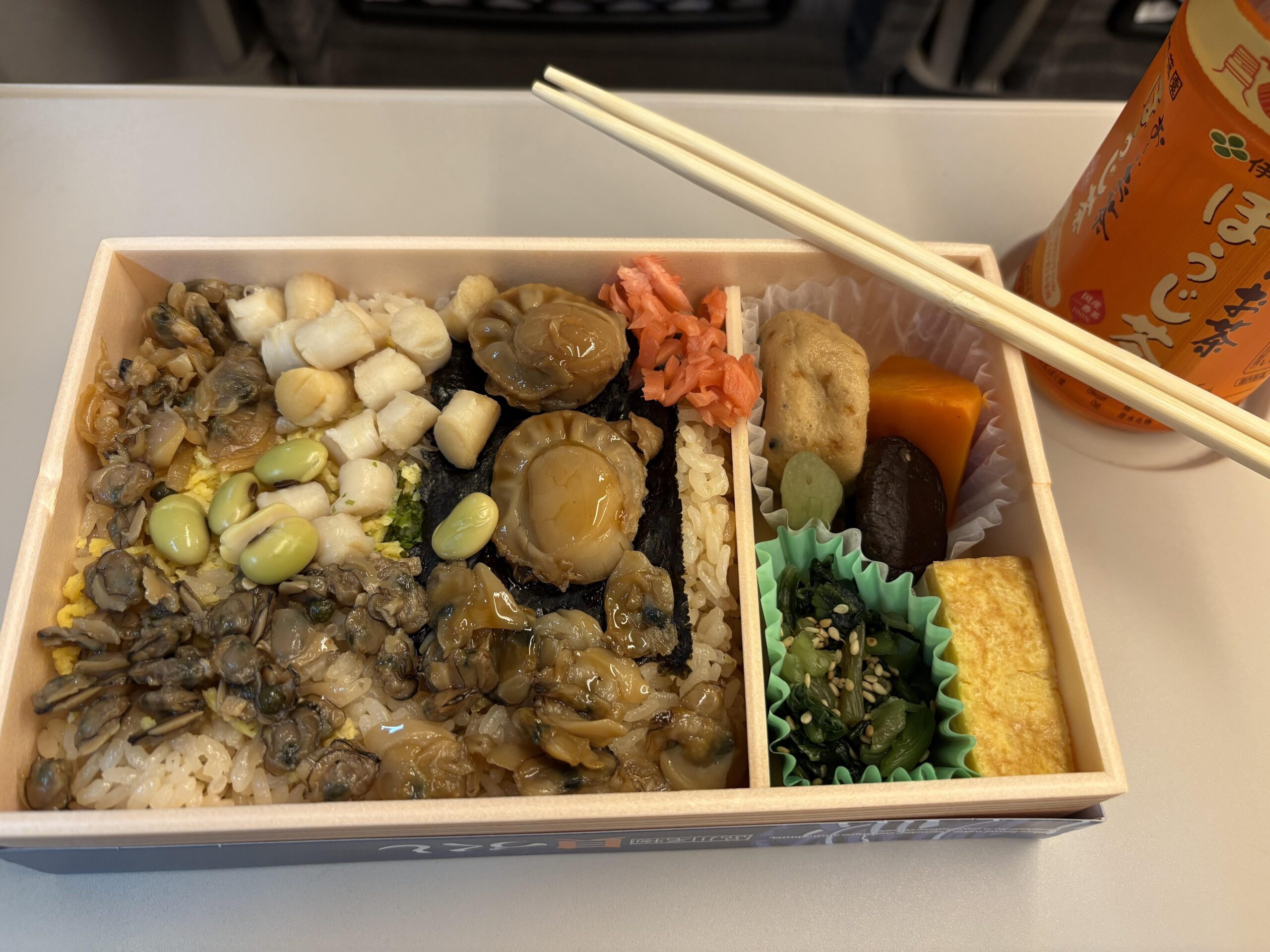 there are two kinds of scallops plus mini Manila clams and shijimi clams. rice is cooked with shellfish dashi. lasted from Tokyo Station to Omiya Station.
