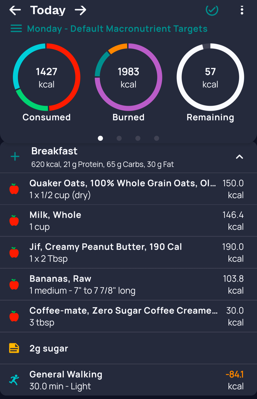 Honestly, if sugar is your issue, I would just cut your pb and the creamer in half. The creamer for sure as it has very minimal nutritional benefits. What %age is your milk? If whole milk, try skim, or half it. That’s a lot of calories. Other than the oats, almost everything else is sugar/and or very high calories. Pb at least has protein. 620 calories is half your daily amount. Think volume. Maybe try a lower calorie fruit later in the day as a snack (like strawberries). Also, I would cut out the butter and oil. I use a spray if I’m cooking.. Minimize dips as well. They are a killer. I would try to up the veggies and protein and lower the fats. Herbs and spices may help quite a bit.