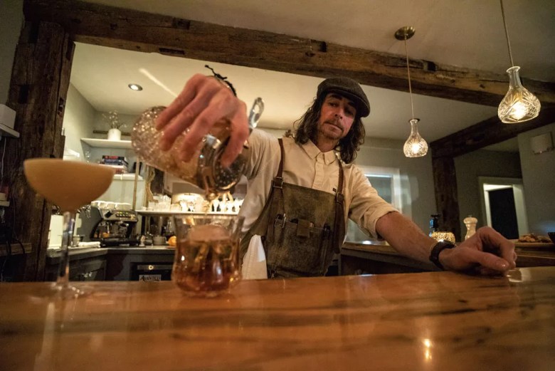 Bartender Ian Budd pouring an old-fashioned cocktail Credit: Jeb Wallace-Brodeur