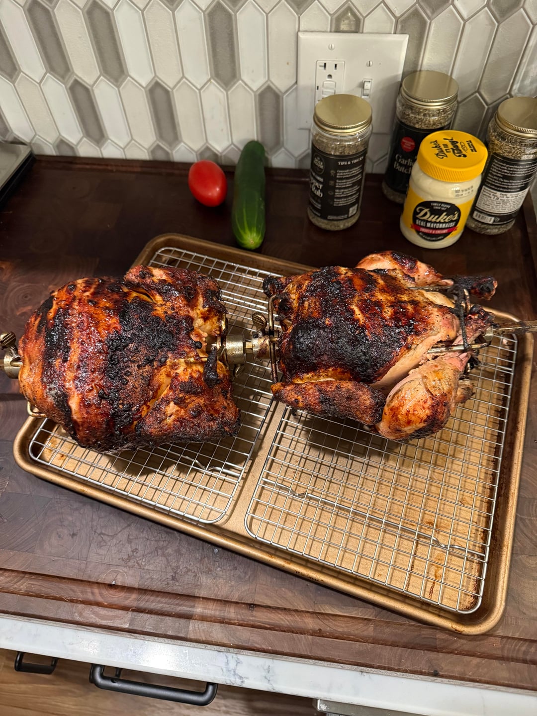 The birds where cooked well but the seasoning wasn’t that noticeable. I marinated for over a day is a Pollo loco seasoning. I’ll probably do a spritz next time during the cook