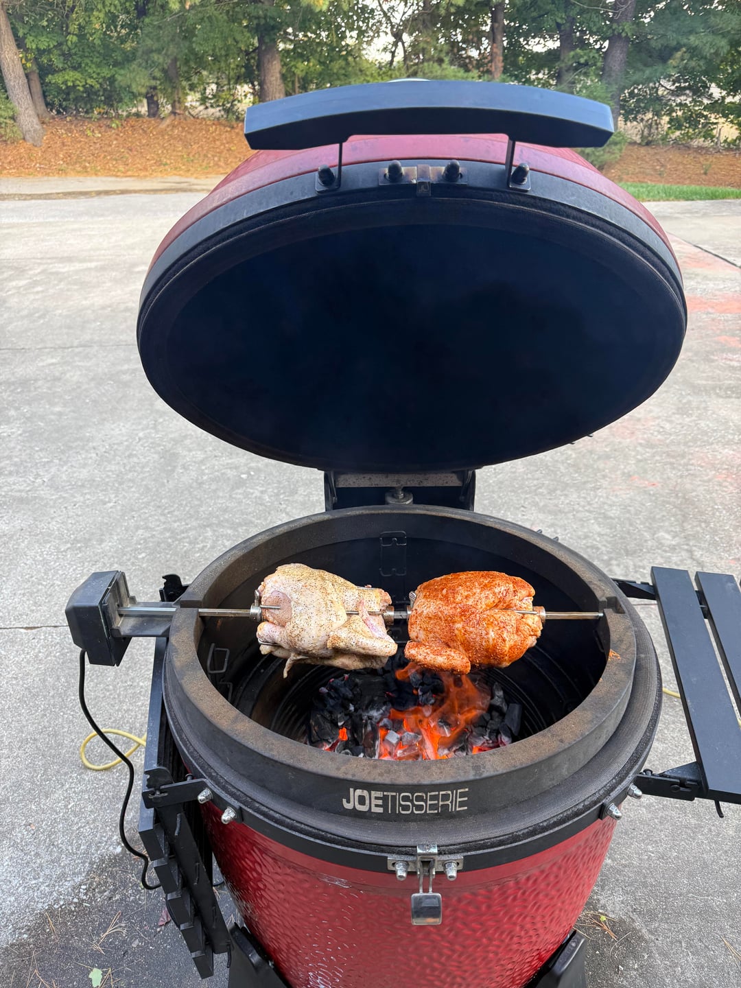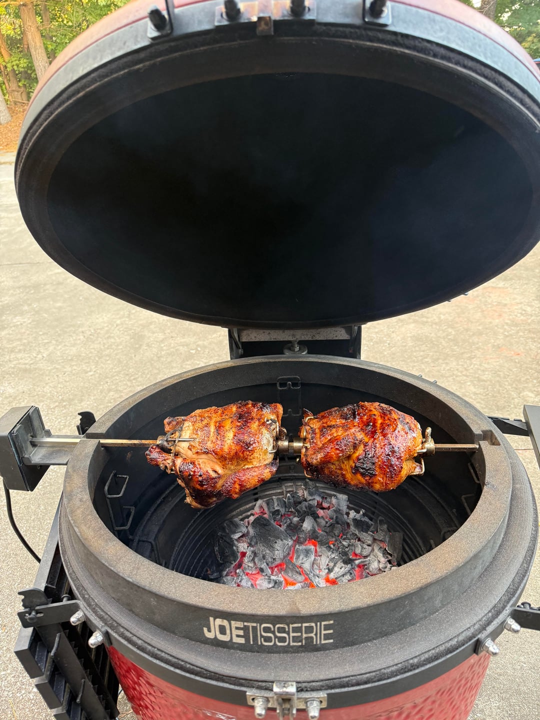 BJ3 chickens on the Joetisserie. Absolutely perfect.
