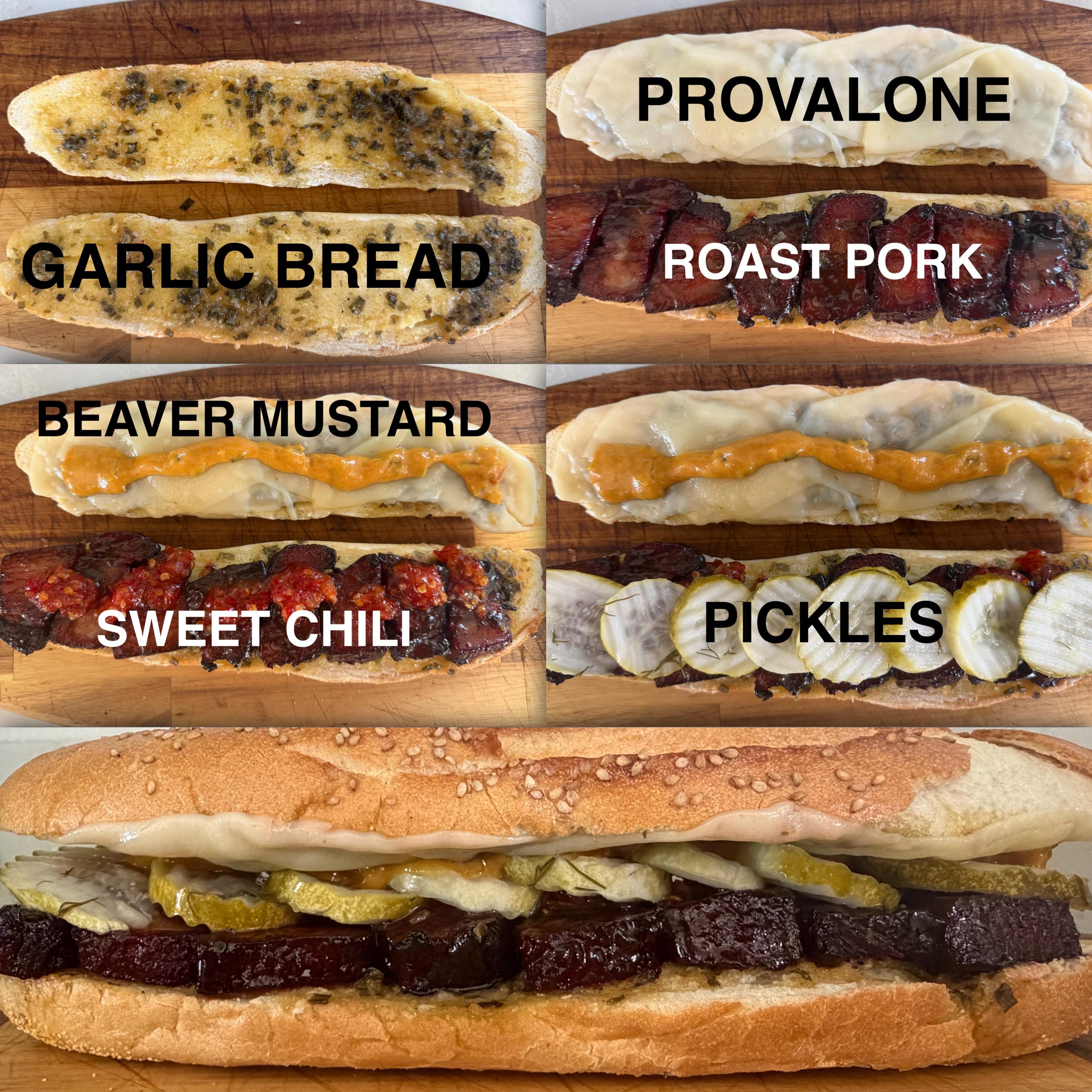 Hailing fromThe Catskills circa 1950s. This is the Notorious RPG!Char Sui Pork Belly, Garlic Bread, Provolone, Beaver Mustard, Mae Ploy Sweet Chili and Pickles.