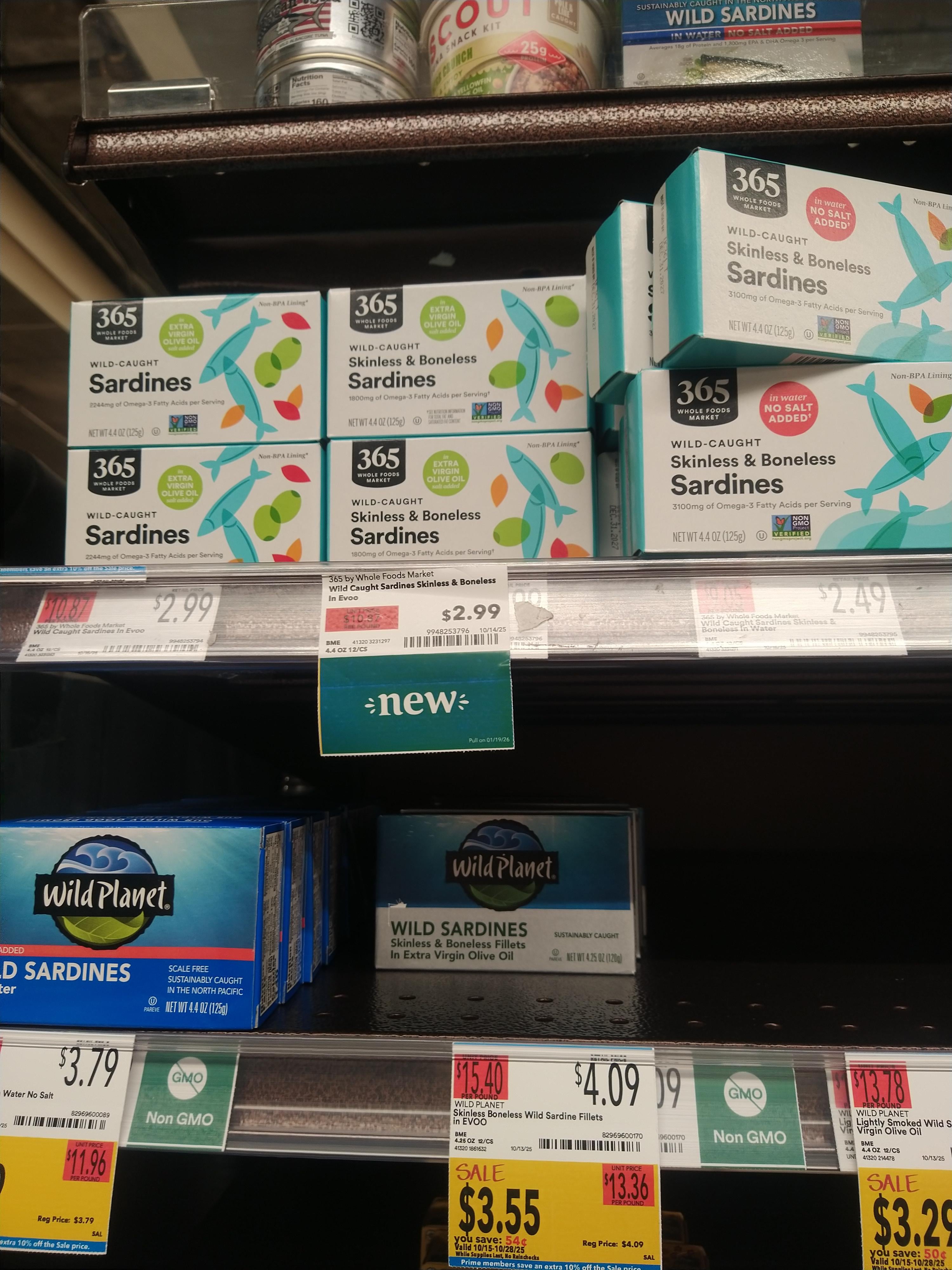 $2.99! I didn’t think anything was that cheap at Whole Paycheck (Foods). I shy away from boneless and anything in water, but sardines in oil sounds great.