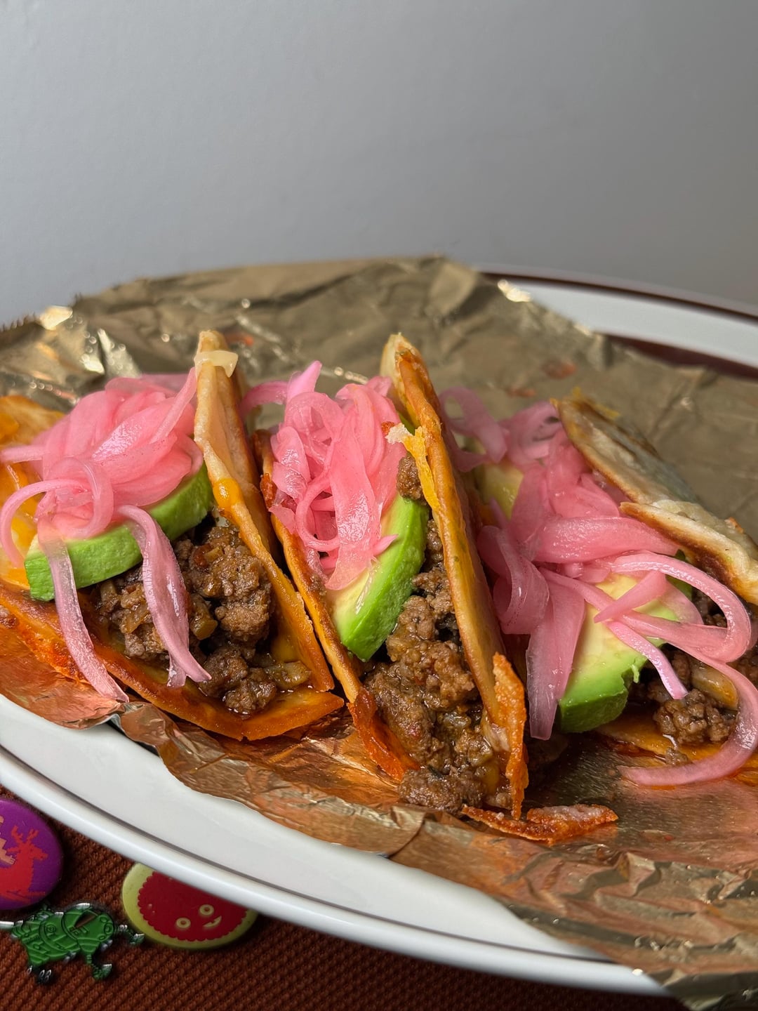 Fried flour torts, smoked cheddar, gringo ground, avo, pickled red onions.by daversa Dining and Cooking