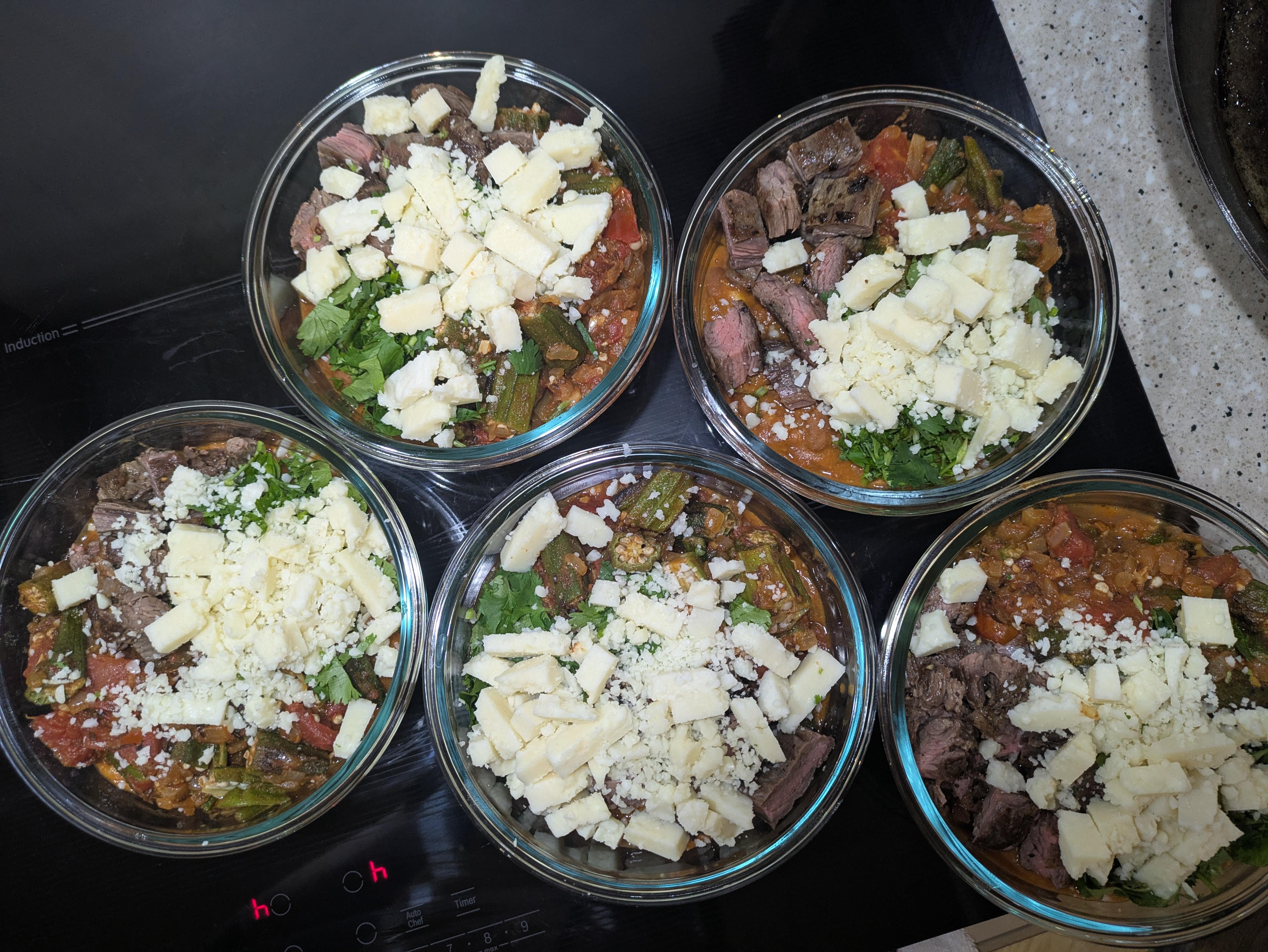 * Portion into dishes and [top with bistec, crumbled cotija cheese, and chopped cilantro](https://imgur.com/a/Bwsh0eT)