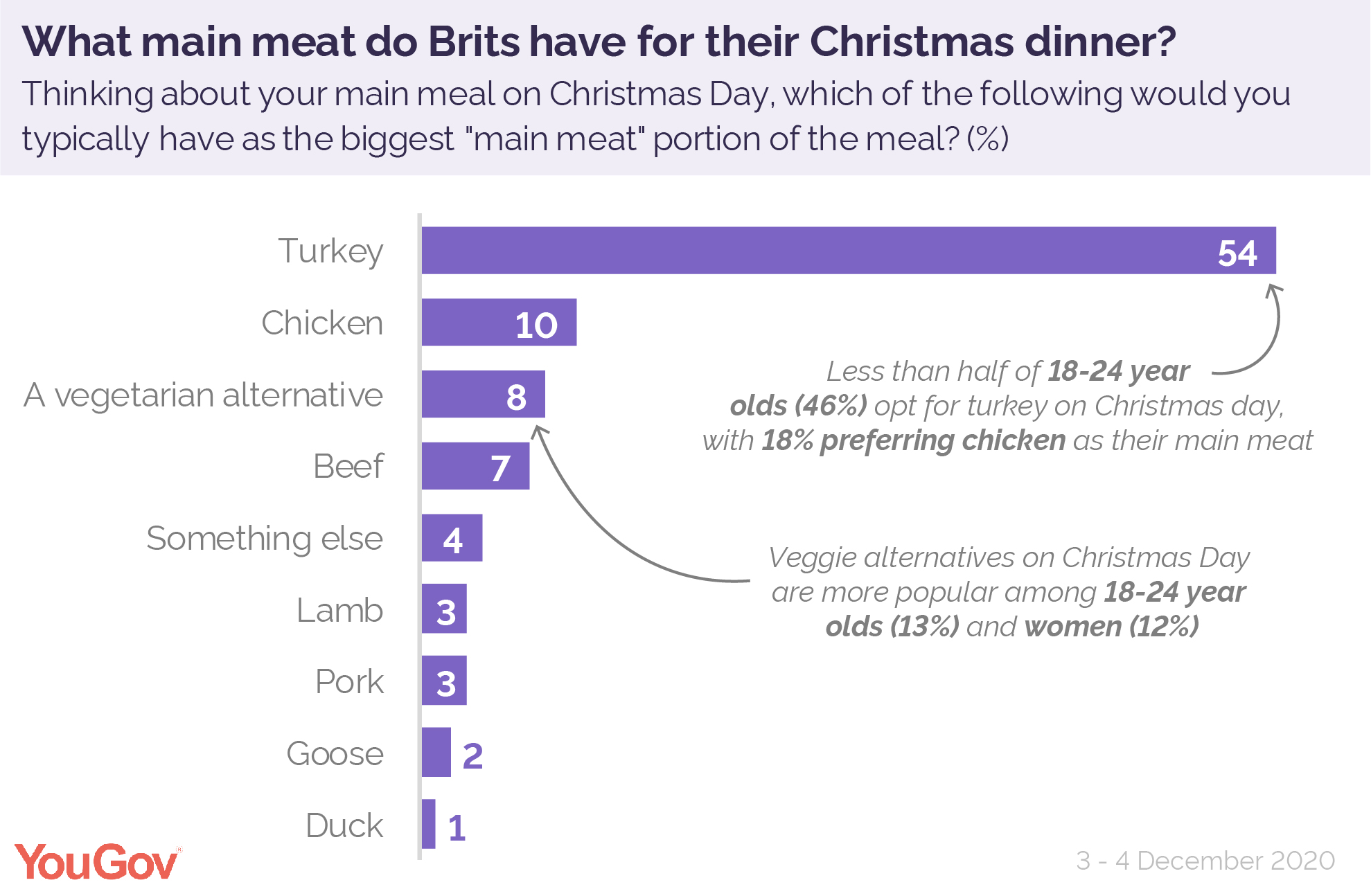 Vegetarian alternatives are the main for 8% of Christmas dinners, but are more popular among the young (13% of 18-24-year olds versus 7% of over 65s). Meat free substitutes are also more favoured by women (12%) than men (5%).