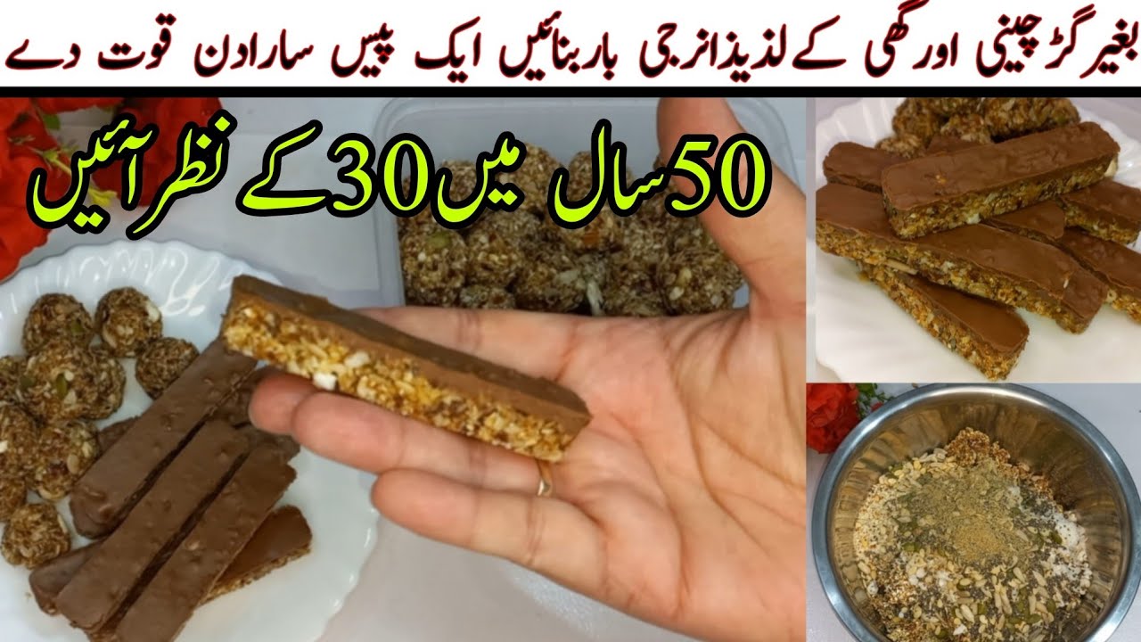 یہ انرجی بارز 100% قدرتی ingredients سے بنائے گئے ہیں — جن میں میں نے استعمال کیا ہے barley (جو)، dates (کھجور) اور nuts۔