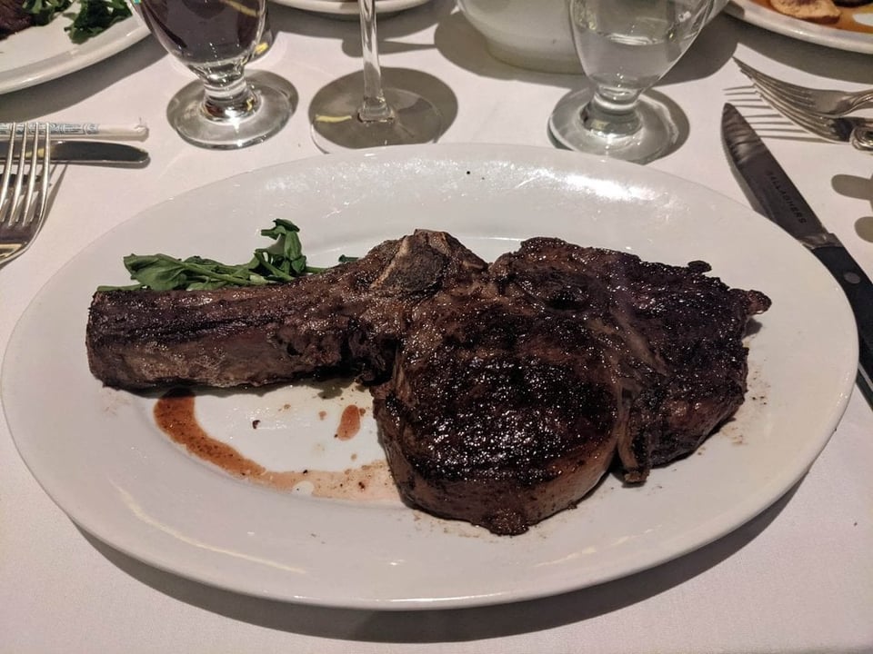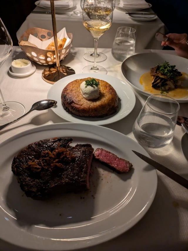 Split the Porterhouse with my dad and every single bite was as tasty and succulent as the first; whatever they cooked it in (butter and fat, presumably) was superb. Service was great, price was steep but not any higher than at other famous restaurants in the city (roughly $140 per person, including an appetizer, the main, a side, a bottle of wine and a shared dessert). Also, some of the best Strudel I've ever had along with a comically huge platter of homemade whipped cream. Loved the whole experience, and the old NY history/charm the place exhudes.