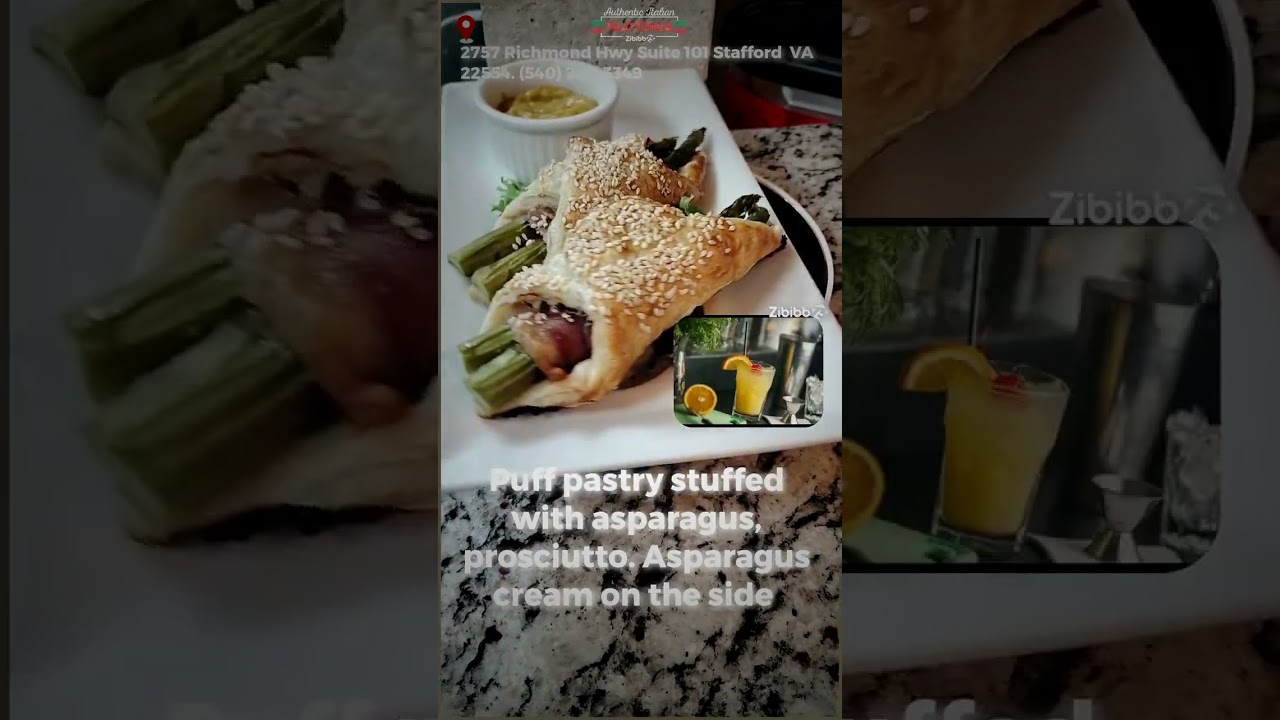 Puff pastry stuffed with asparagus, prosciutto. Asparagus cream on the side “Start your meal the right way! 🧀🍅 Our appetizers are the perfect bite to awaken your taste buds. Who’s ready for a feast? 🍽️✨ #ItalianBites”