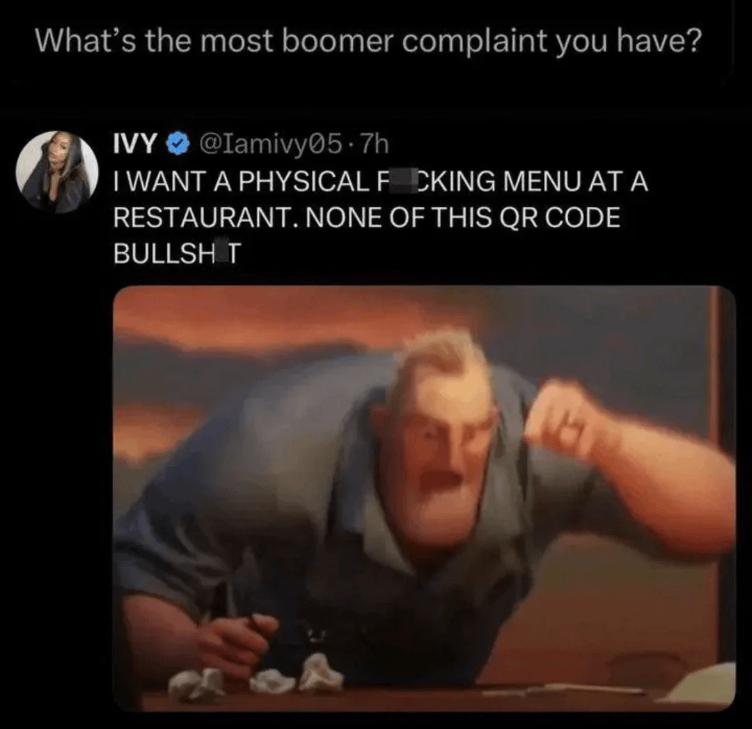 Yeah this isnt a boomer complaint. I don’t want to scroll through the entire menu viewing half of each item one at a time and having to horizontally scroll to read each item. And that’s assuming the restaurant even has good cell signal, which is not a given.