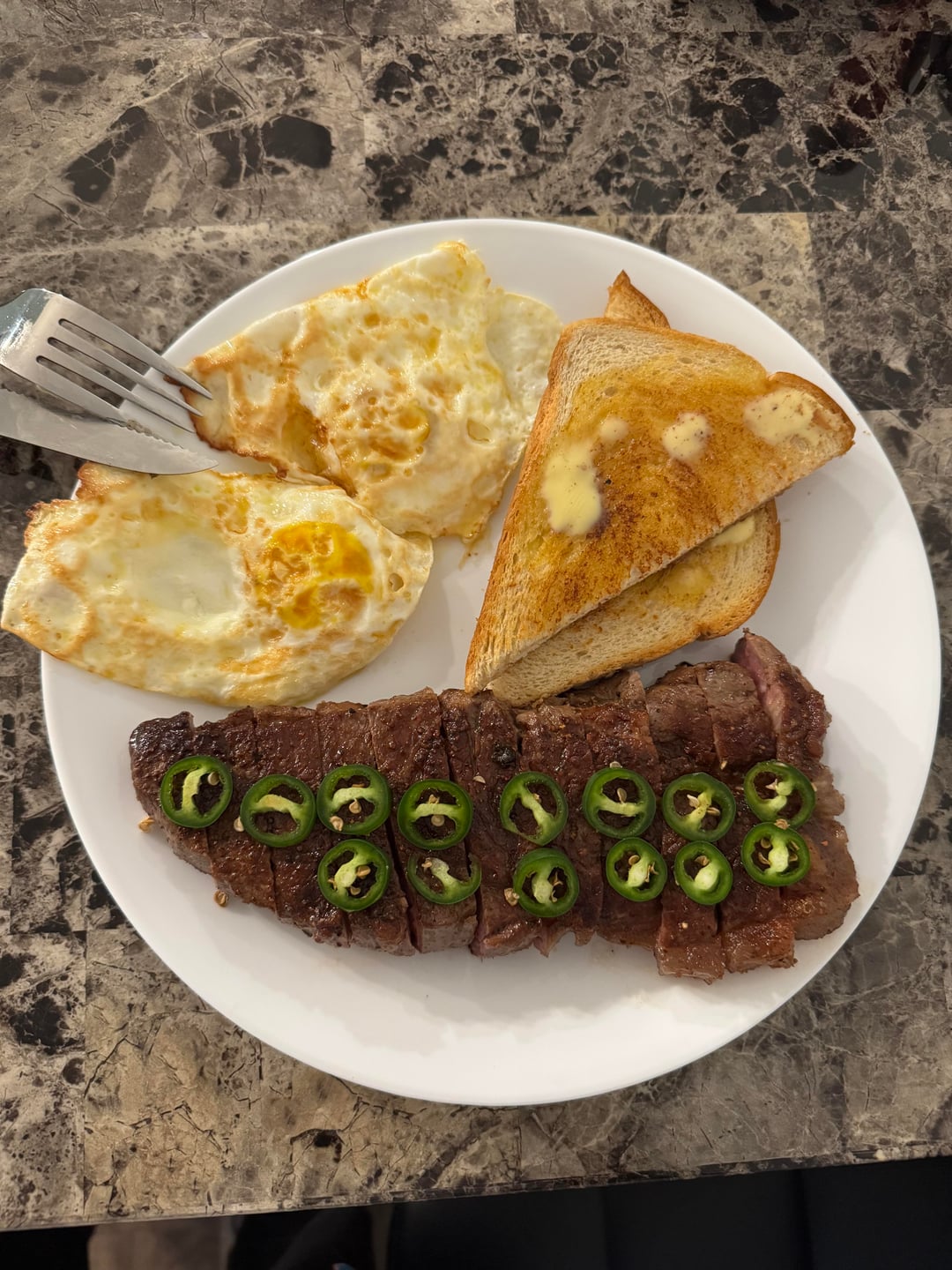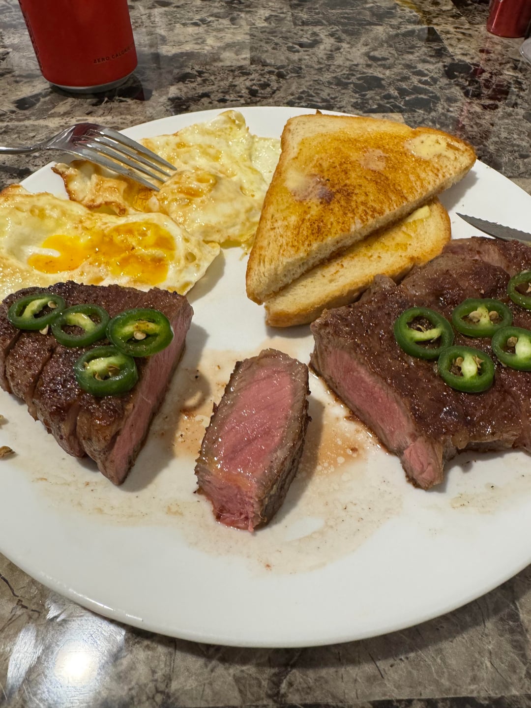 I have only cooked a steak one other time and it had too much of the grey band. This one still had some too… is that too high heat or just cooked a little too long? It did turn out much better and was delicious! Threw some Serrano peppers on top just cause I love spice with everything.