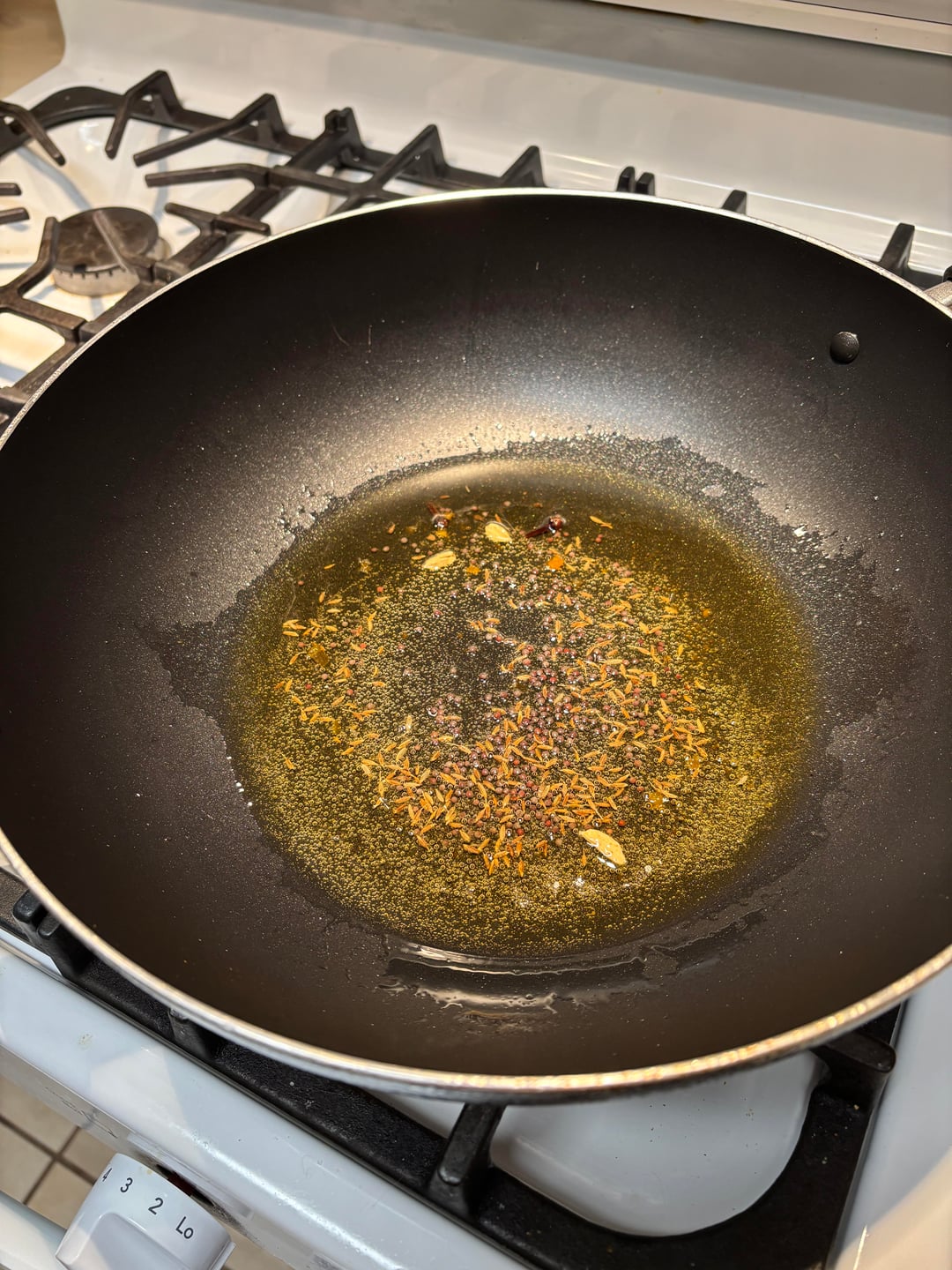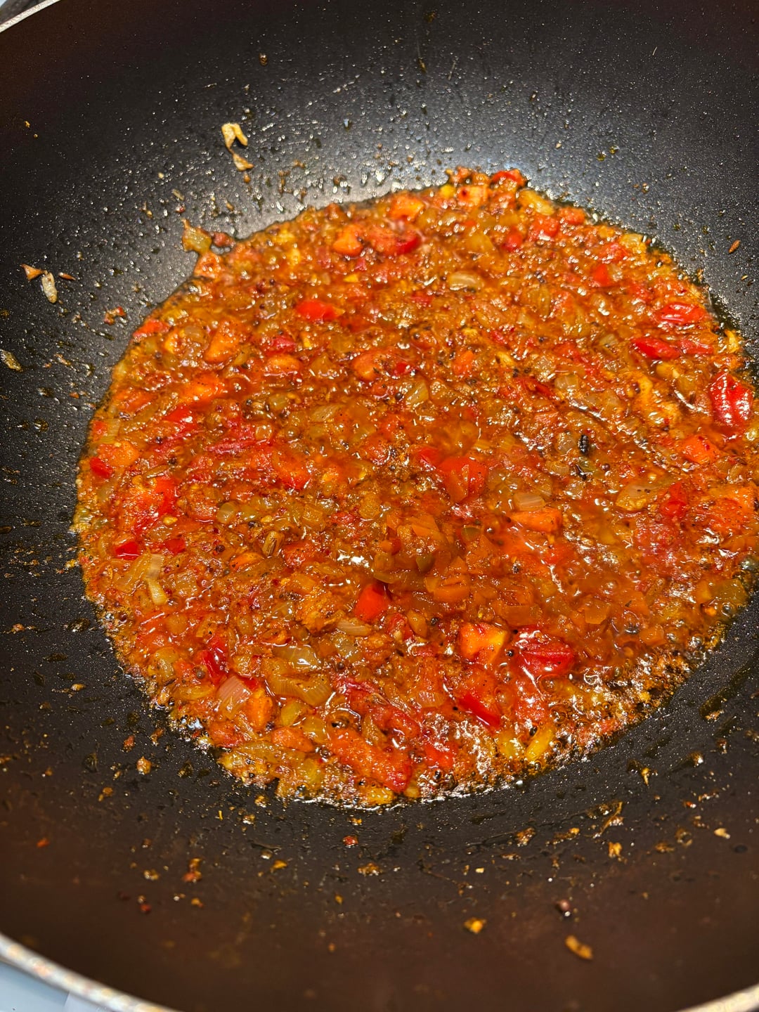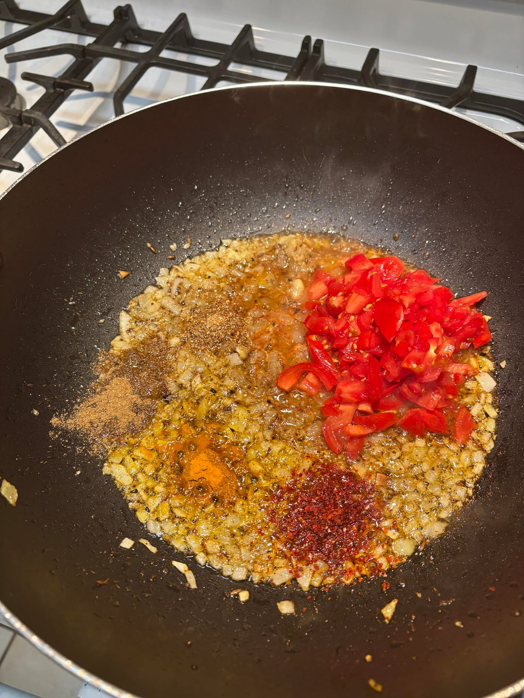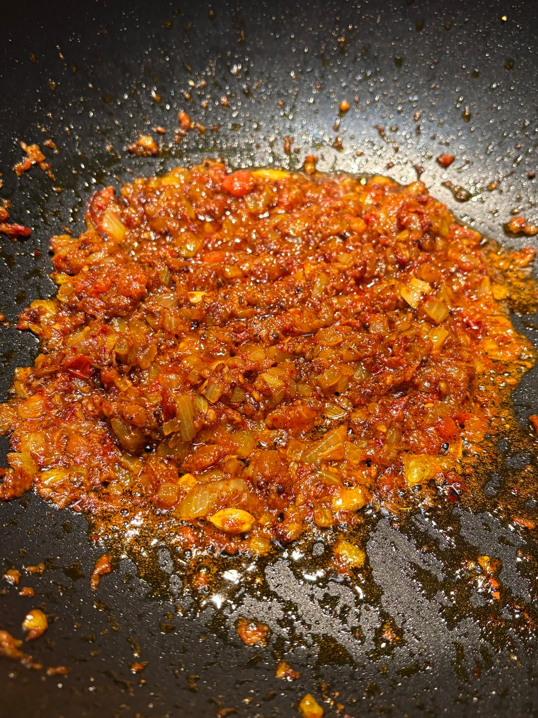 Toast the whole spices in the hot oil until the mustard seeds pop and everything is fragrant then add onions, and cook them until they start to turn brown. At this point, add the tomatoes powdered spices and chili flakes. Stir everything together and cook it until the tomatoes break down and the oil starts to separate.When you see clear tin oil leaching out of the curry, the tomatoes are broken down.