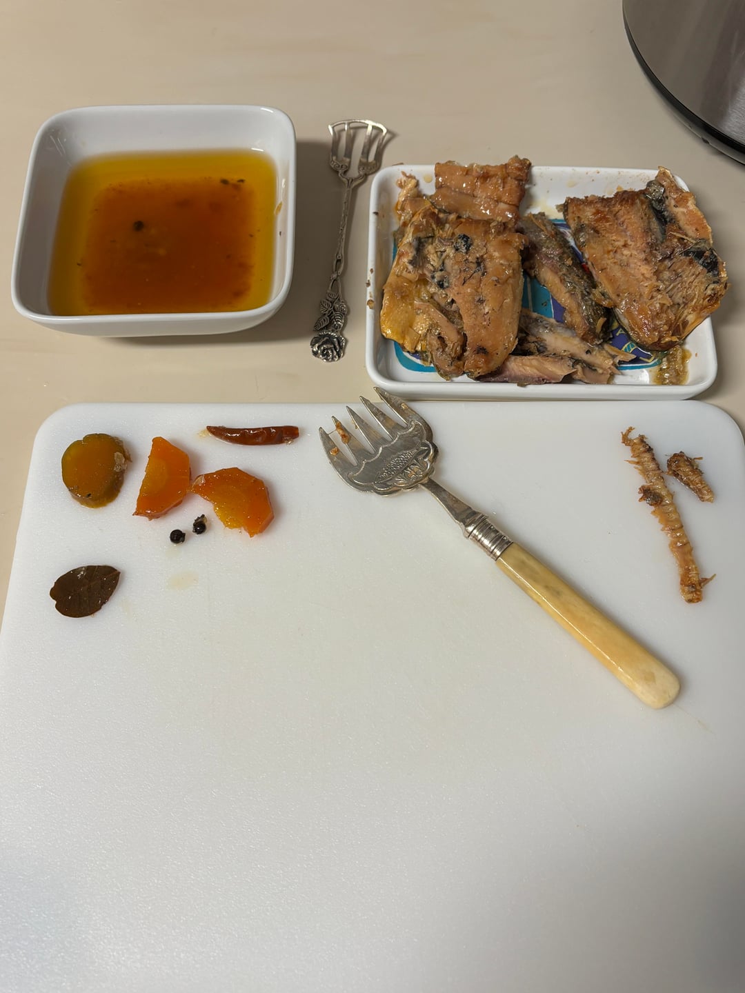 (4) The fish is tightly packed in olive oil with some tomato sauce and vinegar, cucumber, carrot, bay leaf and a couple of peppercorns. As always, I reserved the oil and diced the veg and stirred it in. I also removed the spines with my sardine fork
