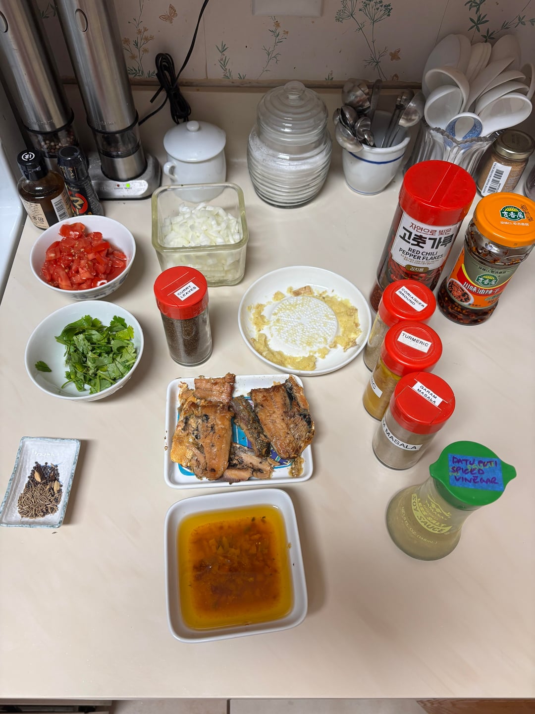 (5) Mise-en-place for the curry: chopped tomatoes and onions, chopped cilantro, ginger-garlic paste, various Indian spices, Korean red chili flakes, spiced vinegar, the Bangus fish, poured off oil from the fish jar, and whole spices.