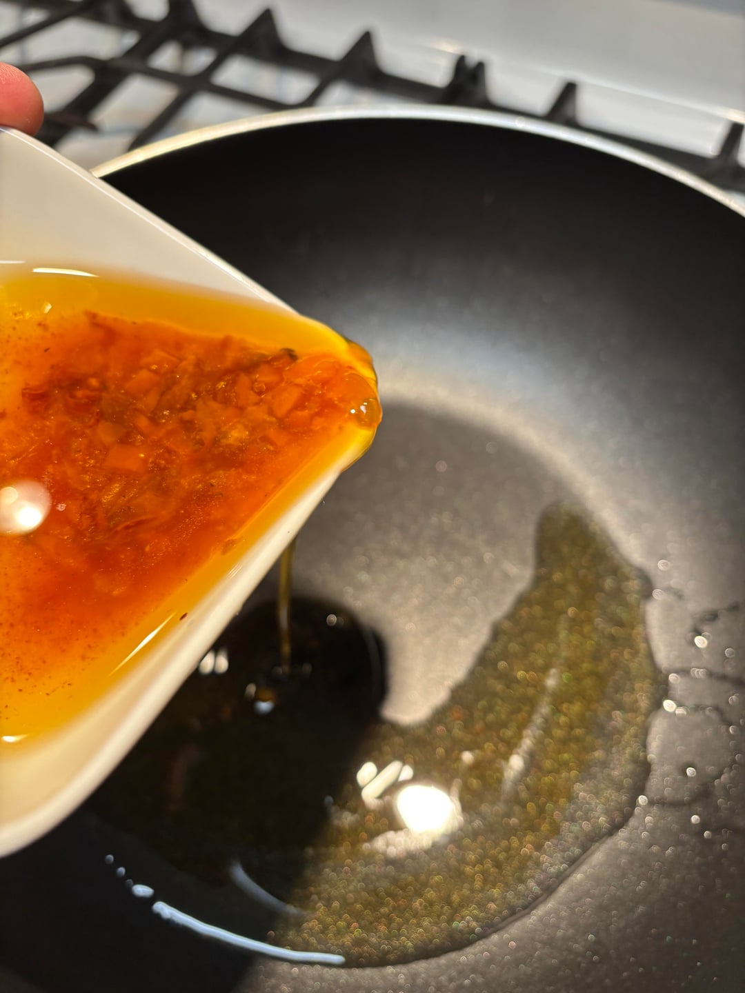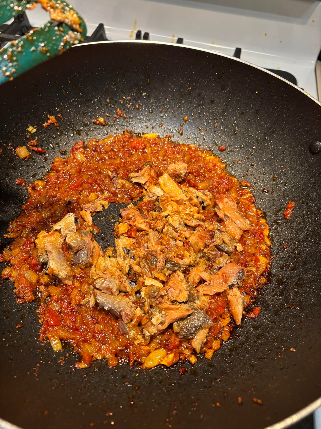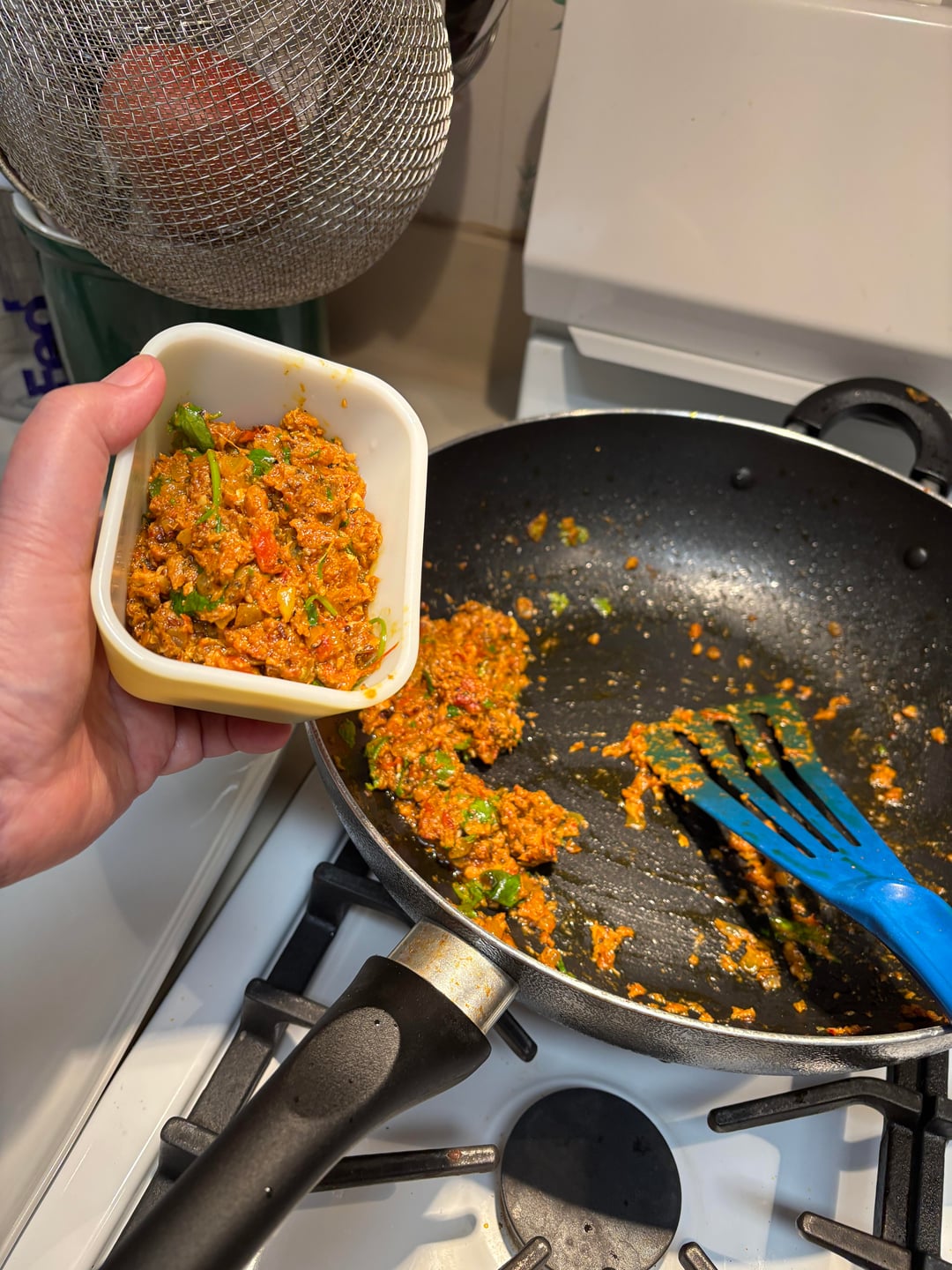 (6-16) Make the curry: I used the fish jar oil, carefully keeping the diced vegetables and tomato sauce out of the pan at this stage. If I had added those at this time, the tomato sauce and the vegetables would have burned. I dis add the diced vegetables and tomato sauce from the jar toward the end of cooking.