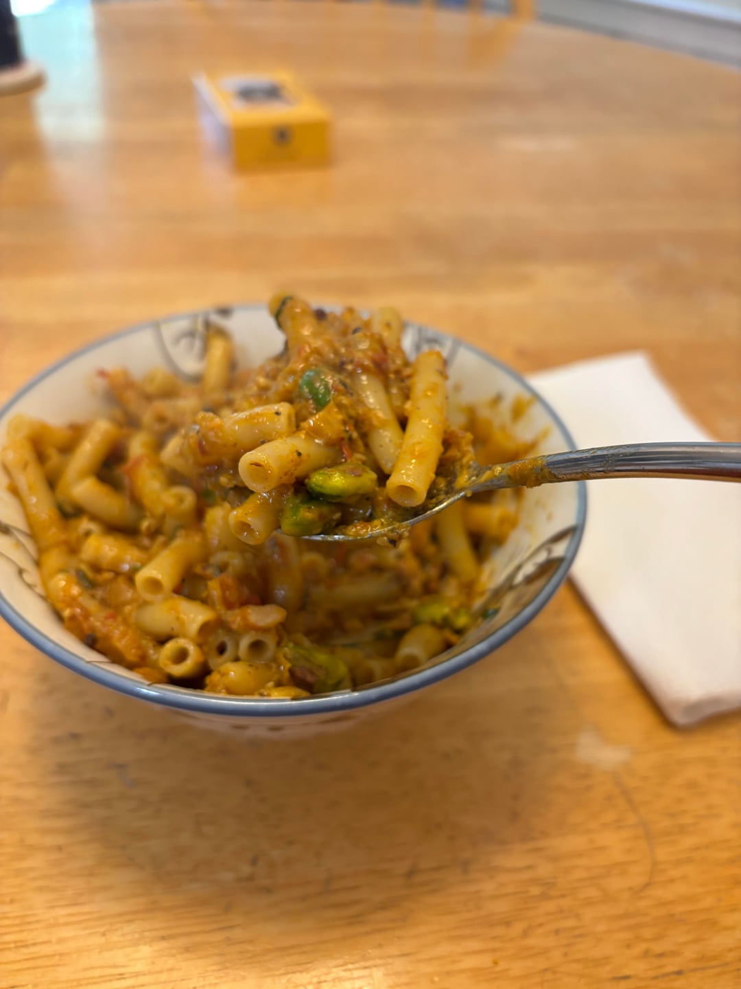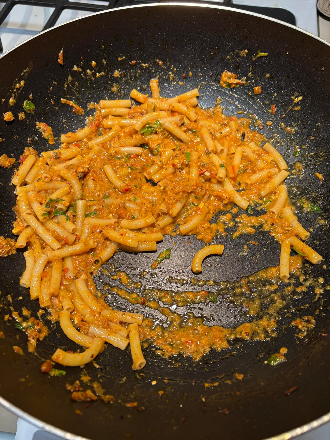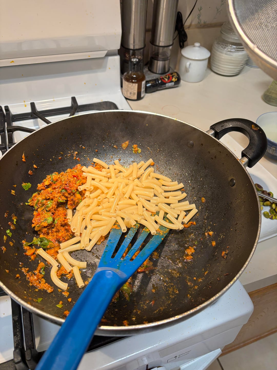 I didn’t have any spaghetti, so I decided to use macaroni. I boiled the macaroni until al dente and then added the macaroni and a couple of ladle bowls of the pasta cooking liquid to the pan. I stirred everything together and cooked it for a few minutes to make sure that the noodles had taken up some of the curry sauce and were cooked through. Time to put the curry in a bowl and take it to the table.