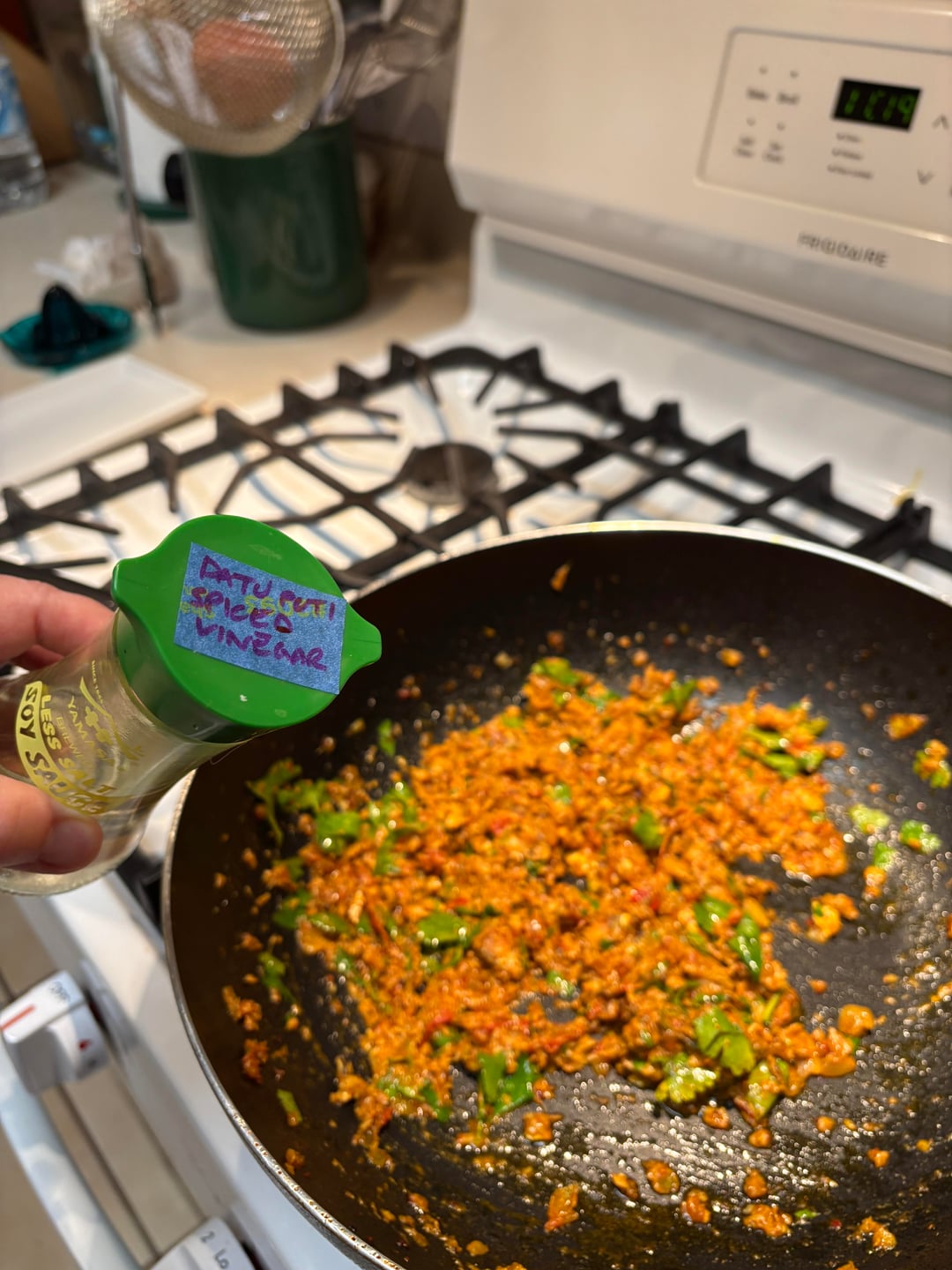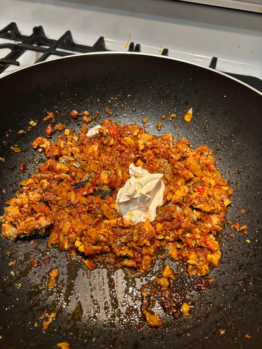 Once the curry is dried out enough to your preference, add the fish and cook for a few minutes. At this point I added sour cream since I did not have the soft cheese that the original recipe called for. I tasted a curry felt it needed a little bit of acid, so I added some Filipino Datu Puti spiced vinegar, maybe 1 tsp.