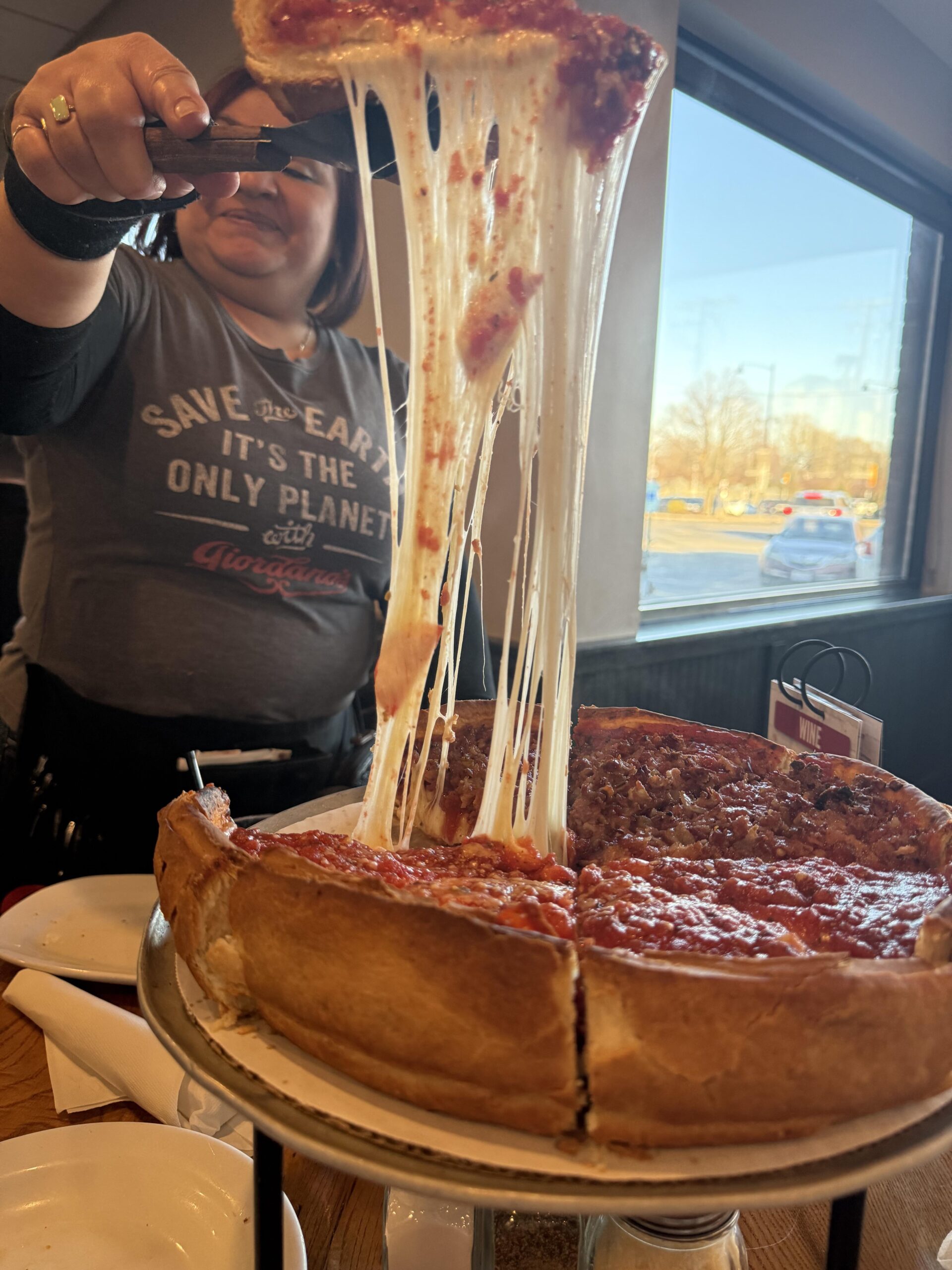 I think the shirt says Giordanos. If so, those is terrible pizza(though was top notch 20-30 years ago). Like, this is dog shit pizza nowadays.
