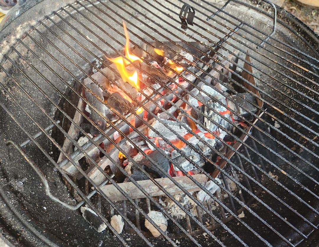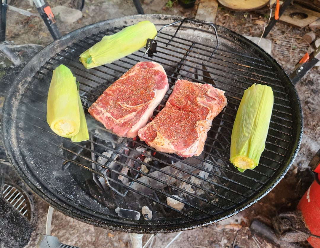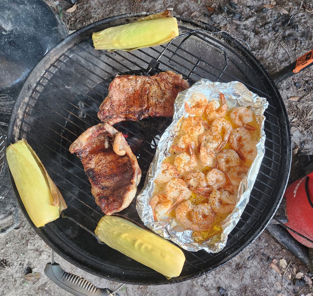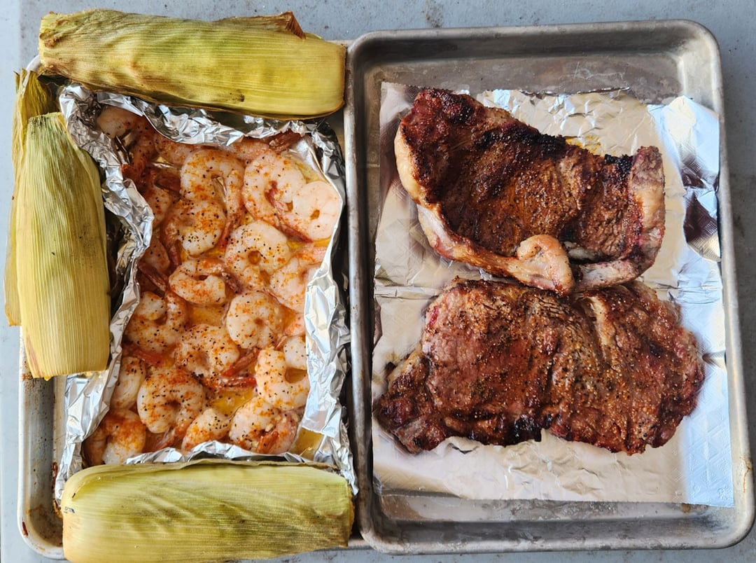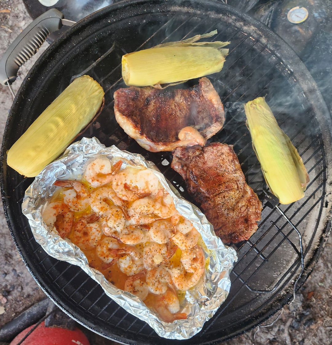 I got charcoal on the 22" weber. I started with the corn in husk soaked in water while it heated up. Salted some ribeyes in advance and oiled them with avacado and then did a little salt pepper garlic paprika. Tossed them on while it was about 500F. Gave it 6 minutes. Flipped them. Added my shrimp scampi. The shrimp are in a tin foil boat in some melted butter with garlic minced in it and some salt and pepper. We dragged the corn through the left over shrimp butter and threw slabs of butter on the steak and let it rest. We are stuffed and happy.