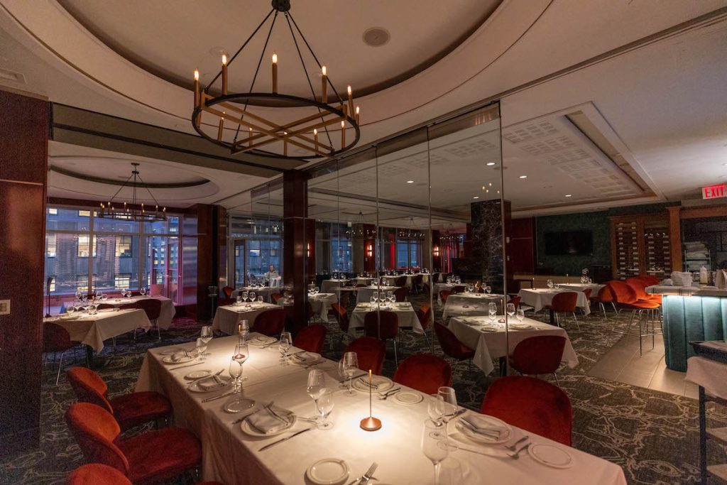 The elevator opens to an expansive dining room that leads into the glass-enclosed terrace that is more causal and offers sweeping views of Rockefeller Center and St. Patrick’s Cathedral where guests can enjoy a snack, cocktail, or a full meal. The terrace features a retractable roof that will be open during the warm weather months and will include an outdoor cocktail bar.