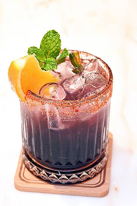 The Java Plum mocktail is a tangy, spicy, and fruity blend with a rim of salt and chilli.