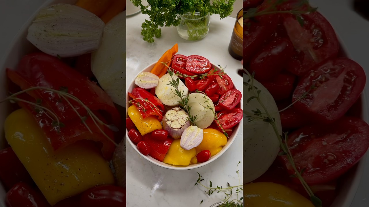 1.Preheat oven to 425°F. Place all veggies on sheet pan or baking dish. Toss with olive oil, salt, and pepper. Add Thyme and rosemary. Roast for 45 min.
