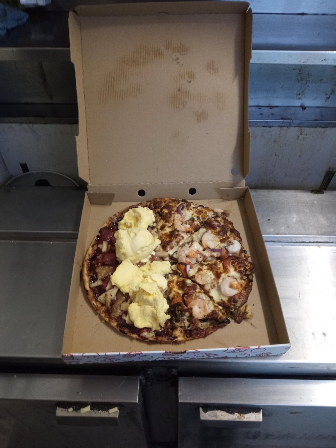 I didn’t get fired for it. On my first day I asked what the worst pizza he ever made was and he had no story. On my last day I hope I gave him one. It’s every topping on one side and chocolate sauce flambé banana whiskey with strawberries and mango sorbet on the other. I ate it all