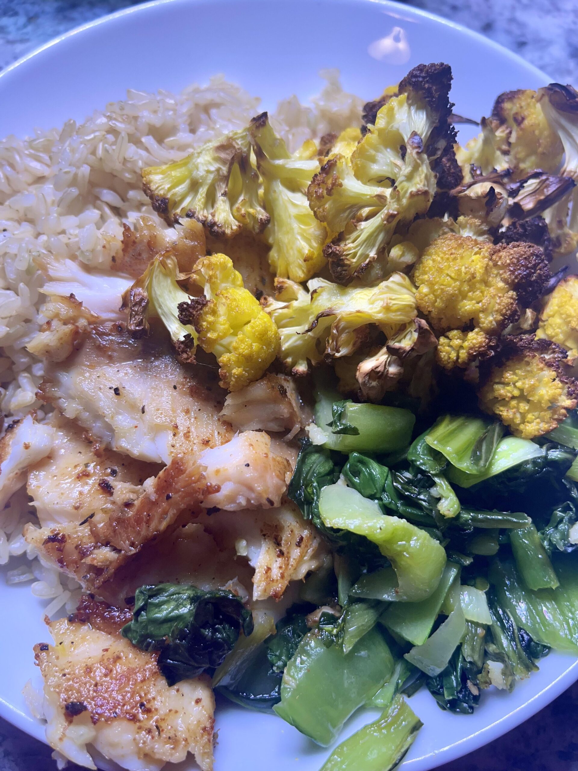 Tilapia: pat dry two fillets with paper towel, then rub with a tiny bit of oil and coat in cajun seasoning, black pepper, and little bit of msg. sear on both sides in a cast iron on medium high heat until internal temperature reads 145F