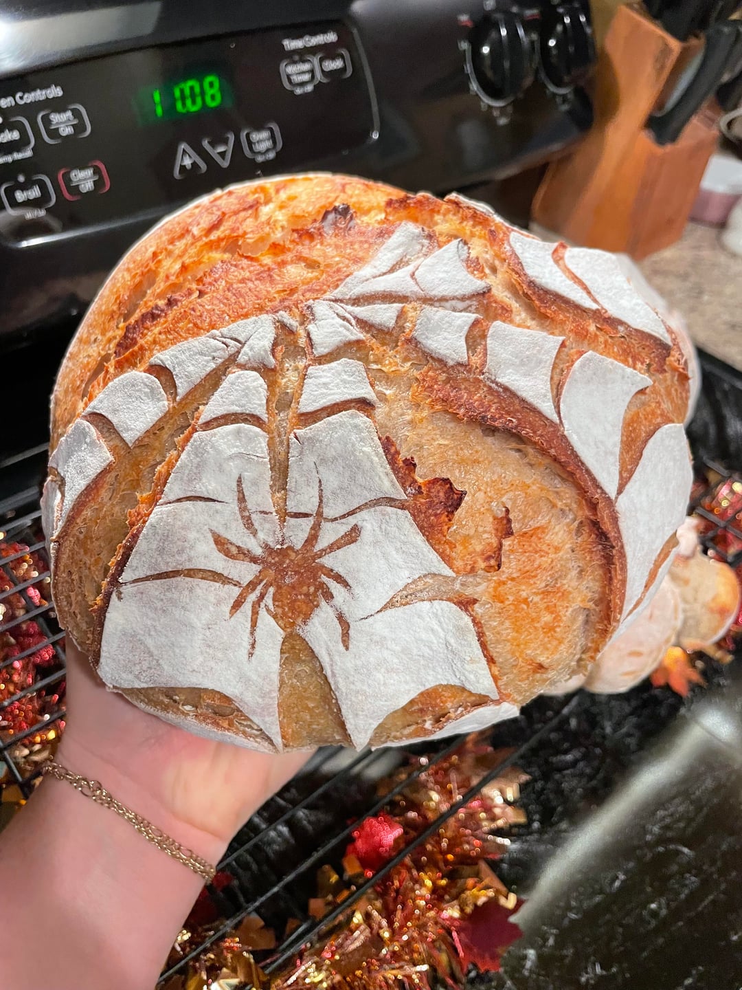 The scoring needs work but this is such an easy design trick! I brushed some water over the little cut out so it would stay while I did my flour layer & scoring. The web needs work…but Charlotte survived!
