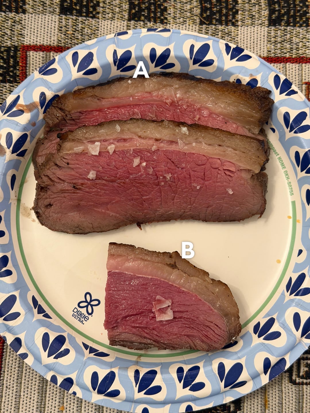* (B) is how it’s traditionally served, with the final cut being thin slices against the grain.