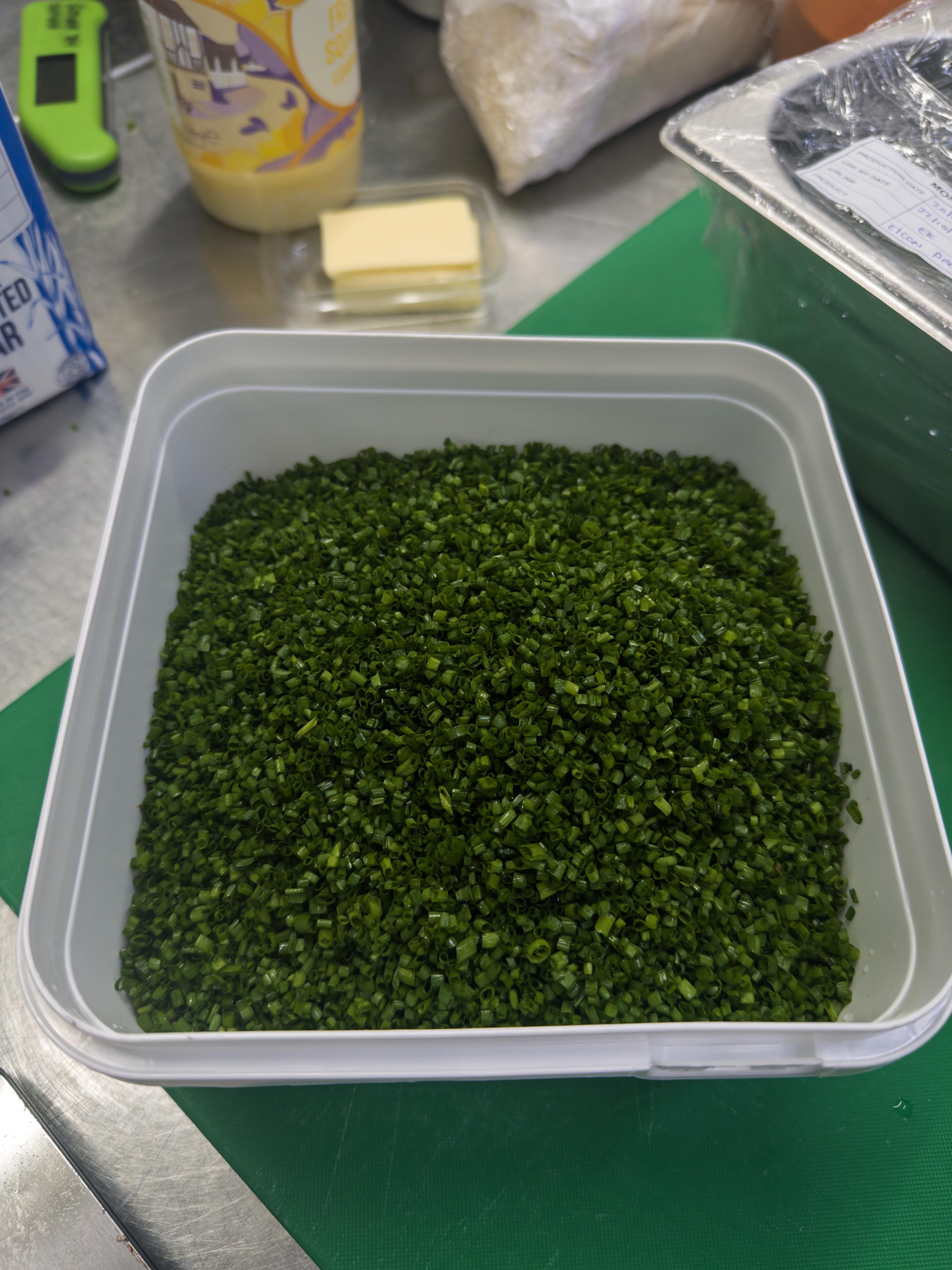 First off, how they get squared and biased chives? Where is the knife control? Tell your coworker they’re staying in the walk in tonight.